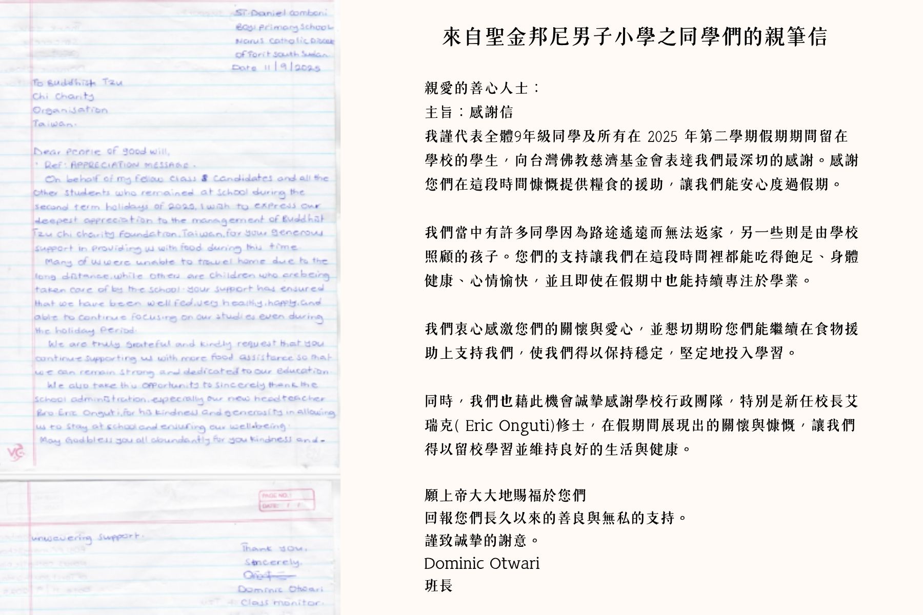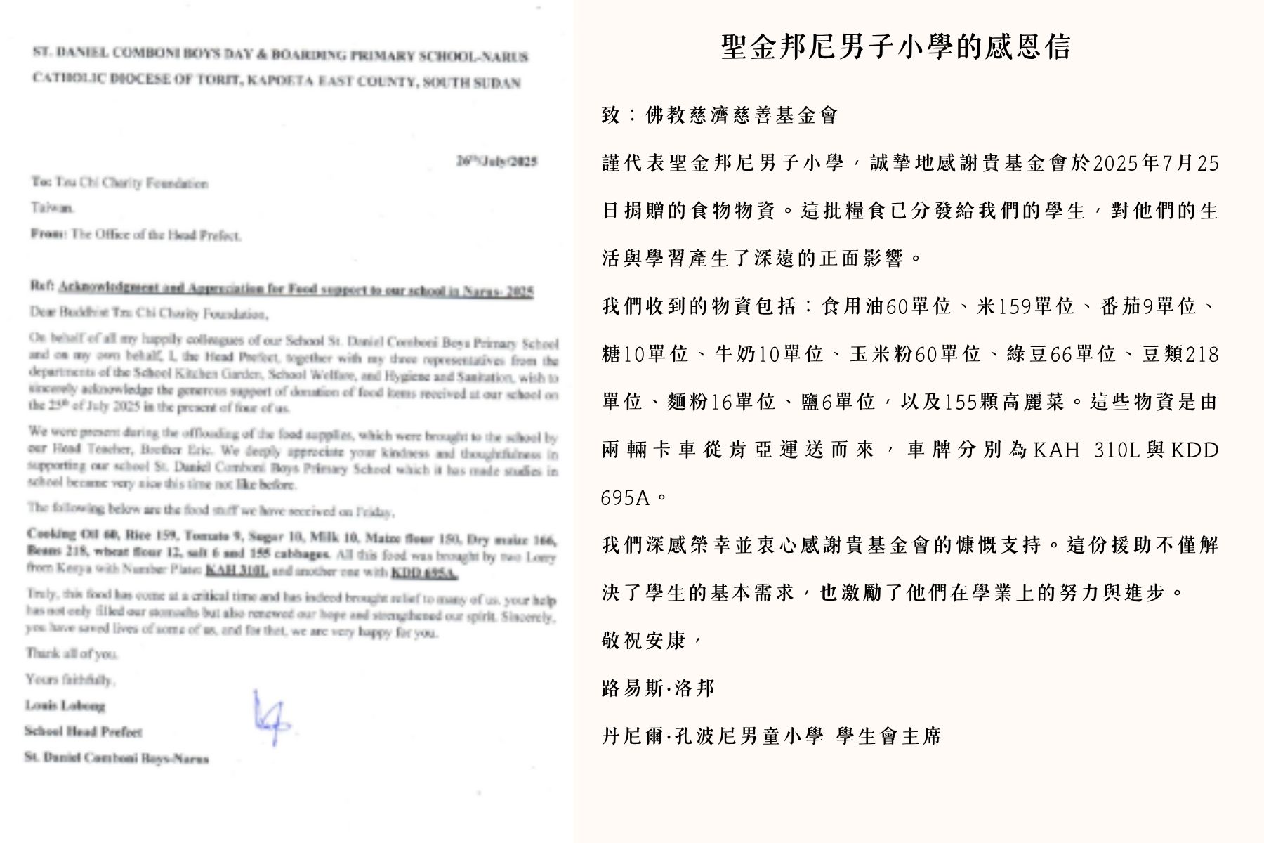 【慈濟援助南蘇丹】築起戰後的希望教室-聖金邦尼男子學校 分享好友 2025/11/13 08:50 ( 11/14 09:32更新) 艾瑞克校長感恩慈濟的援助讓學生們有穩定的糧食。 把握碗中每一粒米,將珍惜化為實際行動,與慈濟同心灑播希望。讓我們攜手守護糧食安全,讓世界最脆弱角落也看見台灣善與溫暖。 慈濟長期攜手南蘇丹天主教教育體系,跨越戰亂與困境,以台灣與全球的愛心守護當地學子的希望。聖金邦尼男子小學特別致函表達對慈濟援助的誠摯感謝。信中洋溢祝福與感恩,也展現學子們對教育重生的期盼。 聖金邦尼男子小學寄來兩封信:一封為學校官方感恩信。 另一封則是同學們的親筆信,字裡行間皆是真摯謝意與期待! 資料來源:慈濟基金會 登入後可以閱讀全文 關鍵字: 天主教 分享好友 喜歡我們的文章嗎?歡迎加入慈善新聞網