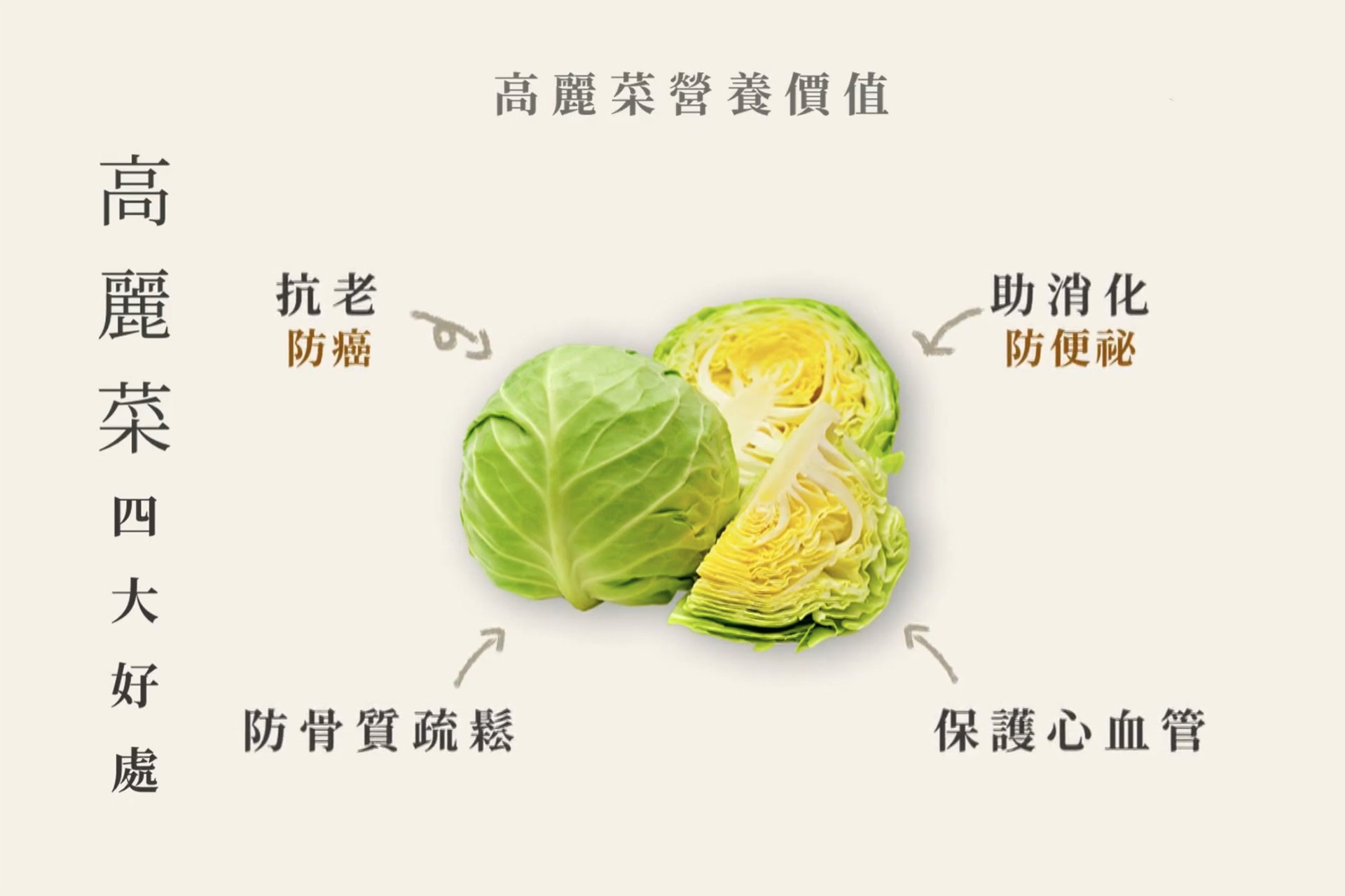 高麗菜作為本次料理的主角,被公認為具備極高營養價值的食材,不僅含有助於抗老化與預防疾病的成分,其豐富的膳食纖維亦能促進消化、預防便秘。此外,相關研究指出高麗菜對於維護骨質健康及保護心血管系統皆有正面助益,是追求健康飲食者的理想選擇。