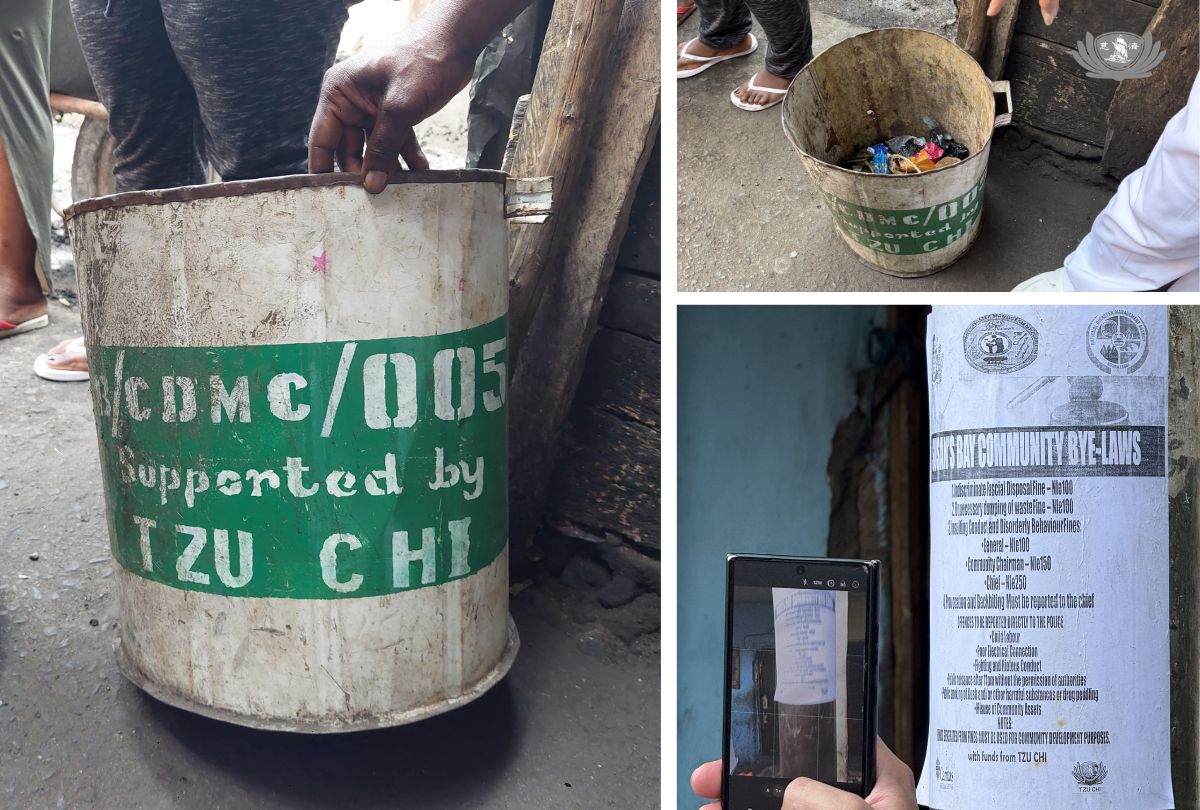 在窄巷中穿梭時,團隊看到了小額補助計畫設置的垃圾桶,以及張貼在牆上的新章程海報。社區防災委員會每日清空垃圾桶,但因將垃圾運送至市區垃圾場需要費用,他們希望慈濟能提供三輪車,讓社區得以自行運送垃圾。