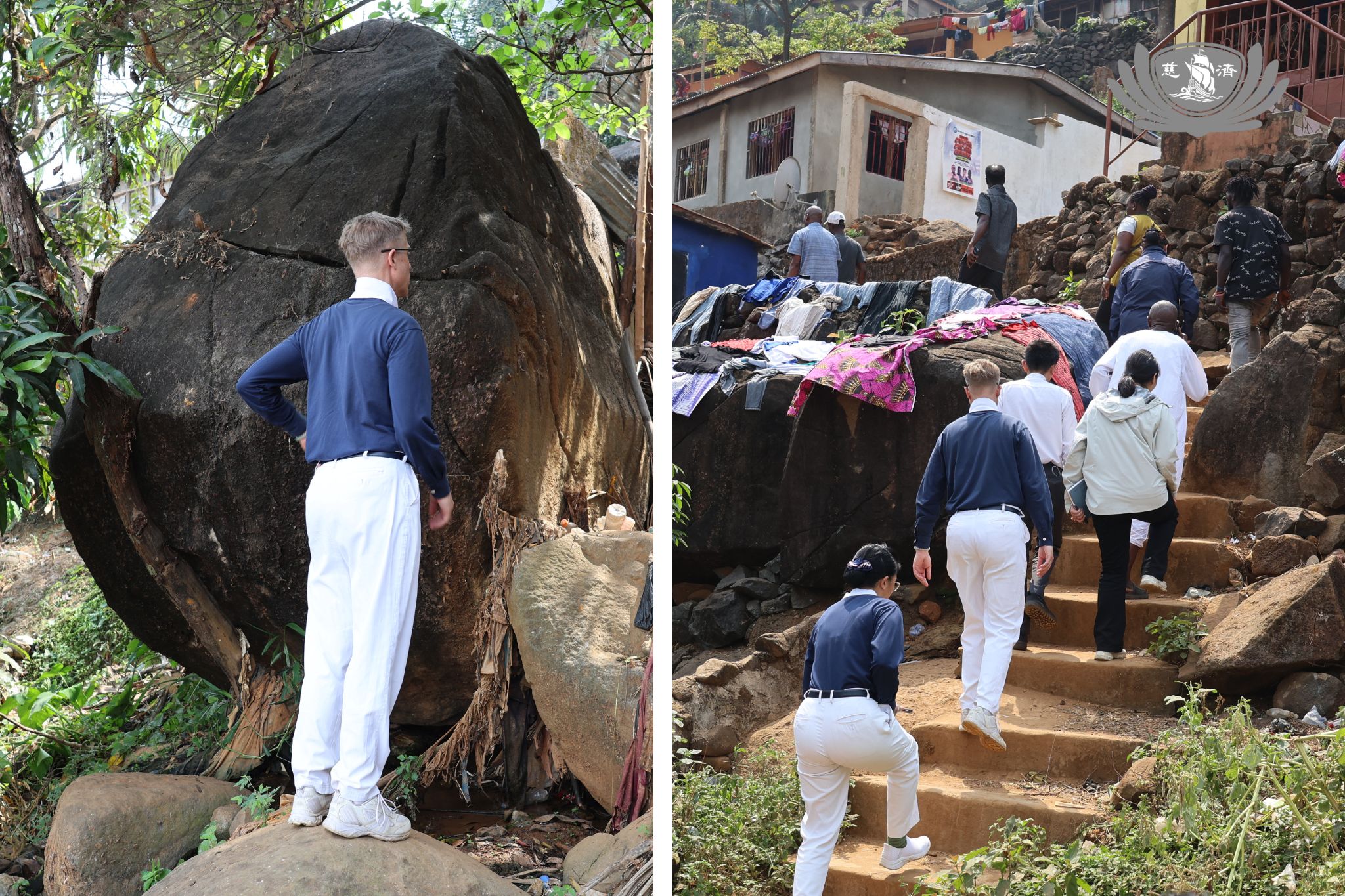 此行上山的主要目的,是查看一顆被認定為危險的懸石。原計畫將其打碎以防滾落毀損下方房屋,但社區發現施工難度過高。歐友涵師兄建議,應由國家減災部門(NDMA)工程師評估,判斷能否以鋼支架固定,或以安全方式破碎而不引發山坡崩塌。懸石上方的橋已倒塌,使山頂居民在雨季進出極為危險。