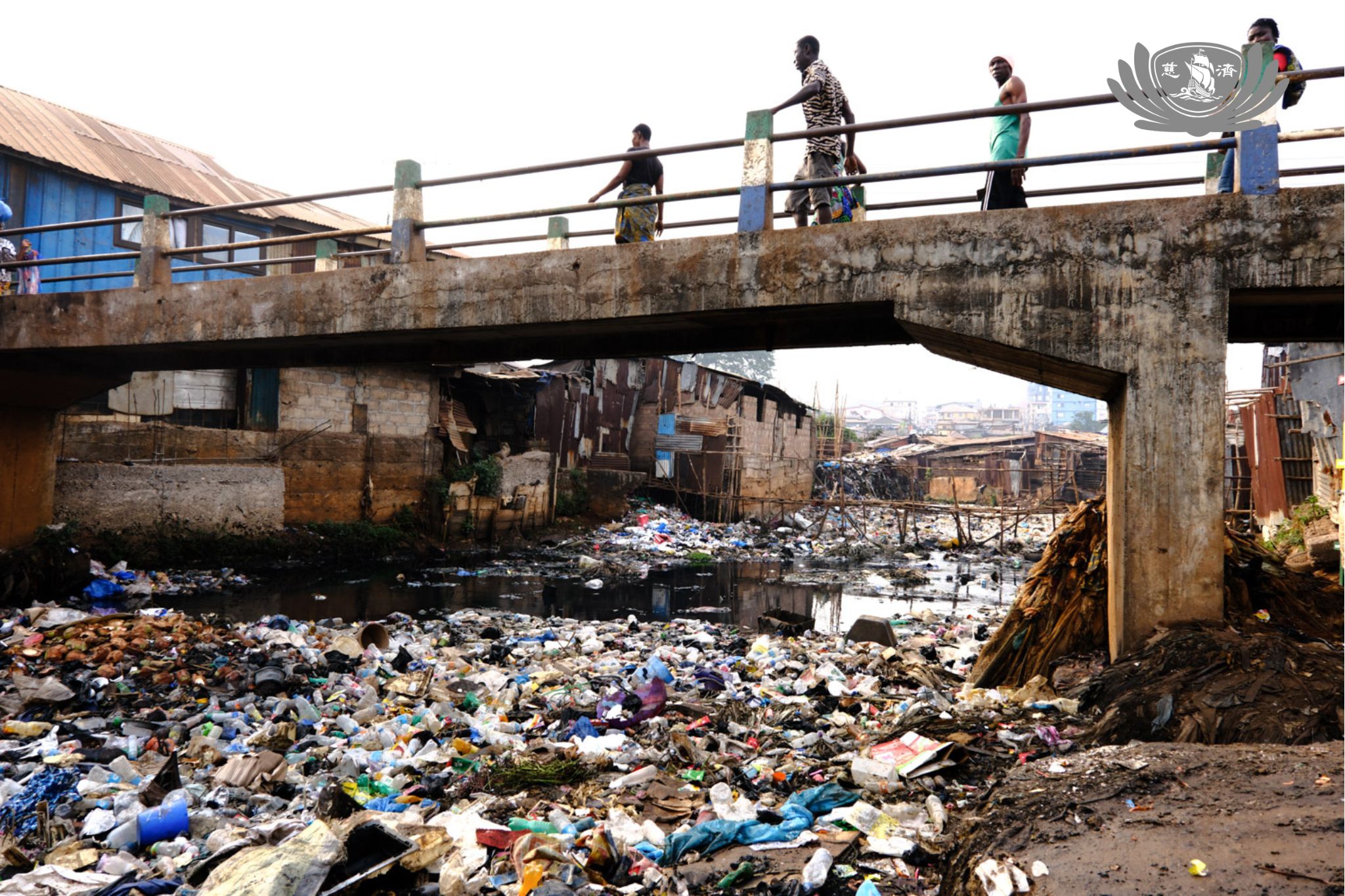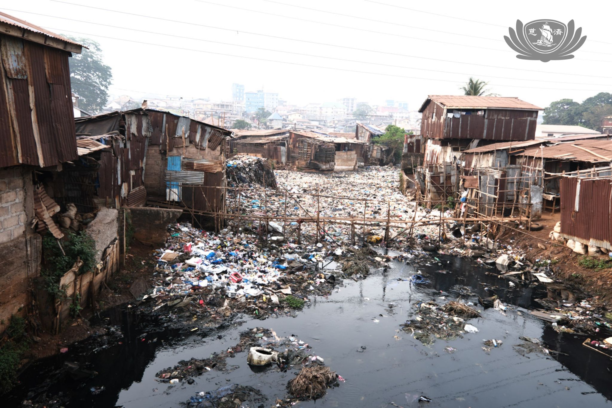 社區領袖在場邊迎接,帶著團隊穿越小巷、過橋,來到廁所與淋浴間的預定地。現有淋浴設施以鏽鋅片和木棍搭建,居民需從大水箱提桶盥洗。用水約每桶10利昂,隨水廠供價浮動。