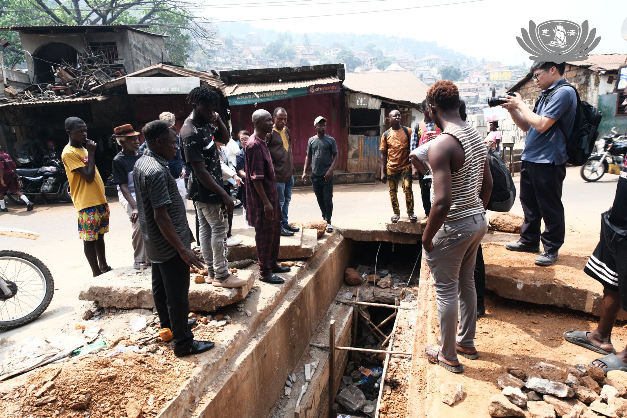 團隊走至河邊,社區主席莫瑞先生(Murray Alie Conteh)展示社區雨量計,說明這是去年未發生洪災的關鍵——居民能依水深即時判斷何時護產、何時撤離。
