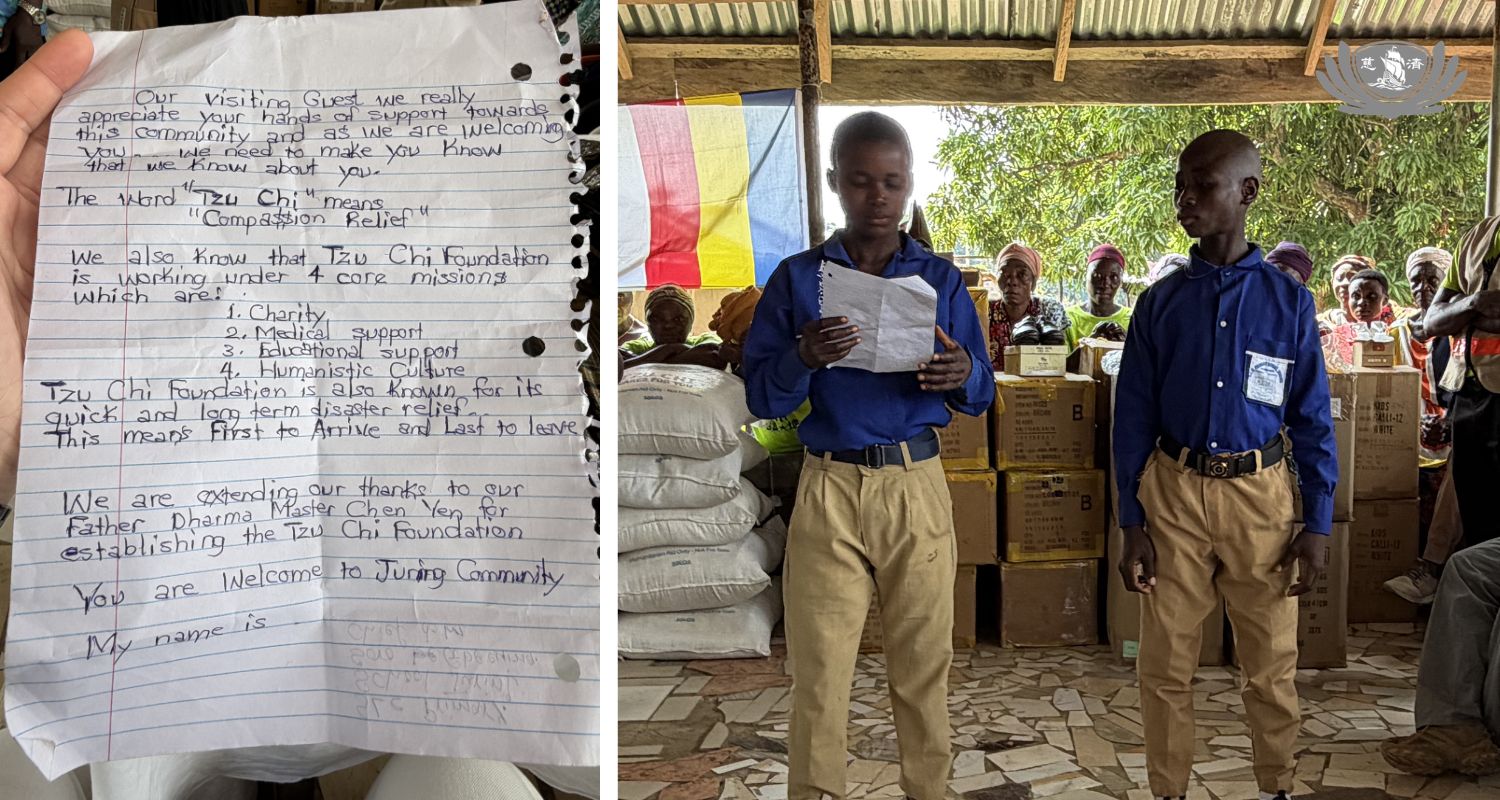 我們知道,慈濟基金會以四大核心使命為工作方向,分別是慈善、醫療、教育、人文,同時也以迅速且長期的災難救援行動而聞名——『第一個到達,最後一個離開』。我們在此向證嚴上人表達誠摯的感謝,感謝他創立了慈濟基金會。歡迎您來到朱林社區。」