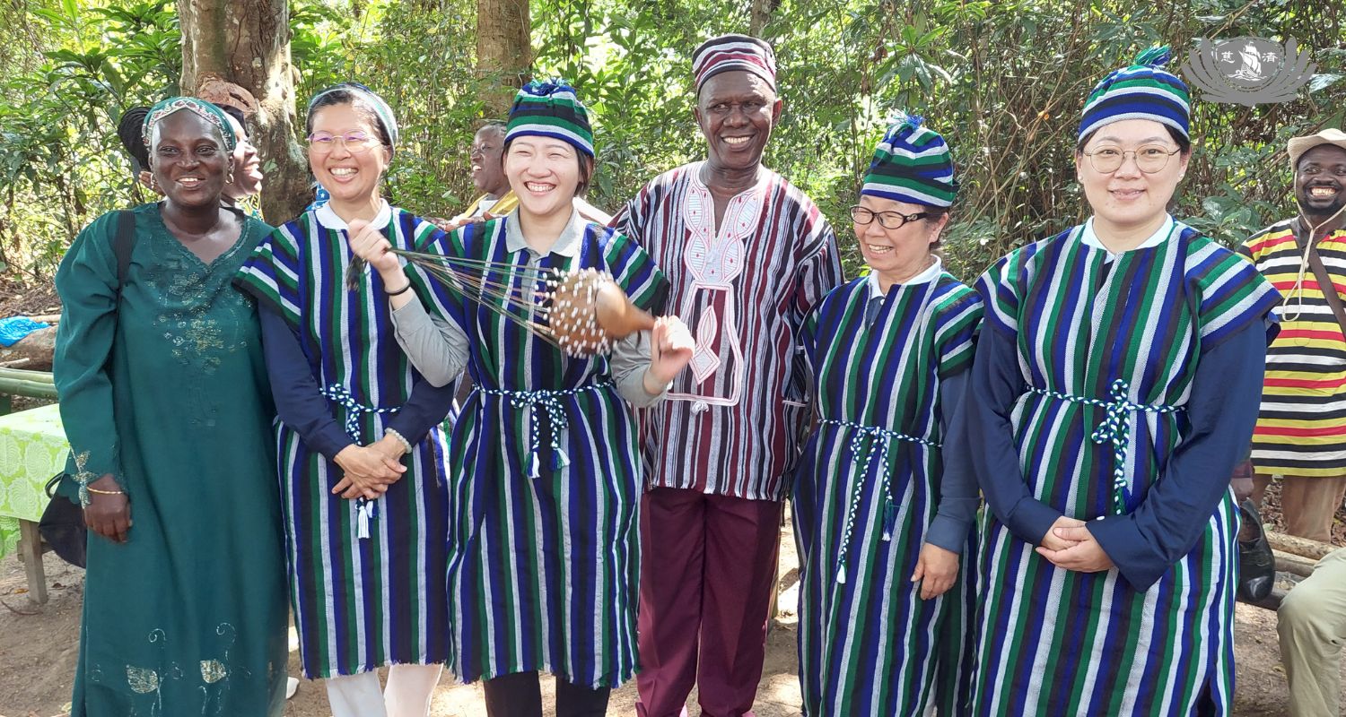 抵達拉圖村入口的聚會場所時,青年們在樹蔭下以鼓樂舞蹈迎接。酋長贈予慈濟團隊每人一件有著獅子山國色的白藍綠色手工織布服飾與帽子。坦巴先生也提供組織(TWIN Salone)的完整文件,包括章程、財務管理政策、性別政策、員工政策,以及2026至2027年的計劃提案。
