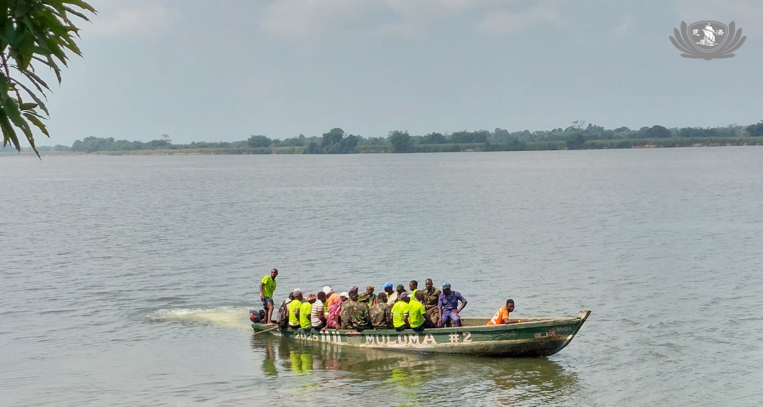 團隊再次來到登船的淺灘,準備渡河回到村莊。因居民也陸續搭船返家,酋長雖極力控制人數請大家搭乘下一班船,但居民一窩蜂擠上小船,造成船身大幅搖晃。慈濟團隊成員皆感不安,陳思擔師兄此時以緩和的語氣說,若真的落水請不要緊張,頭上仰讓身體自然浮起來。褚于嘉師姊則突然從包包中翻出兩個夾鏈袋,讓眾人將護照和手機放進去以防濕掉。所幸船夫駕駛穩當,平穩開至對岸,未有過多晃動。