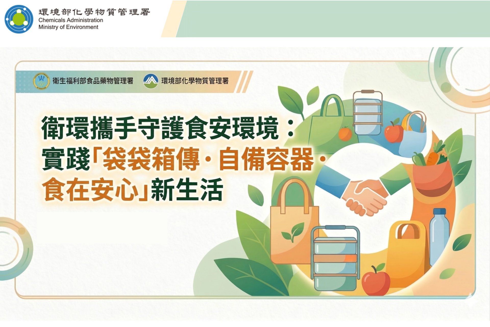 環境部化學物質管理署(下稱化學署)署長蔡孟裕與衛生福利部食品藥物管理署(下稱食藥署)署長姜至剛,今日共同召開記者會,呼籲國人實踐「袋袋箱傳‧自備容器‧食在安心」新生活,不僅落實減塑,也宣導食品容器的正確安全觀念,提倡從使用源頭作起,守護你我健康與地球美好環境。