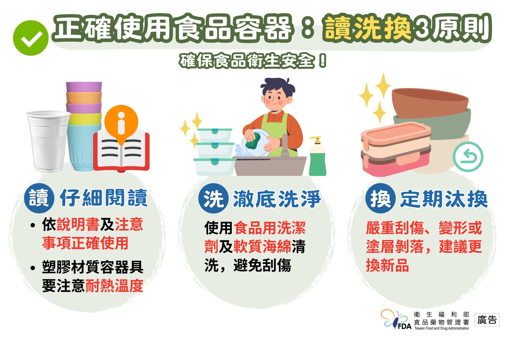 食藥署署長姜至剛表示,民眾常見自備的食品容器具材質包括塑膠、不鏽鋼及玻璃等,各類材質於耐熱性及使用方式上有所差異。因此提醒,重複使用之食品容器具,使用時應把握「讀、洗、換」三原則,以確保食品衛生安全: