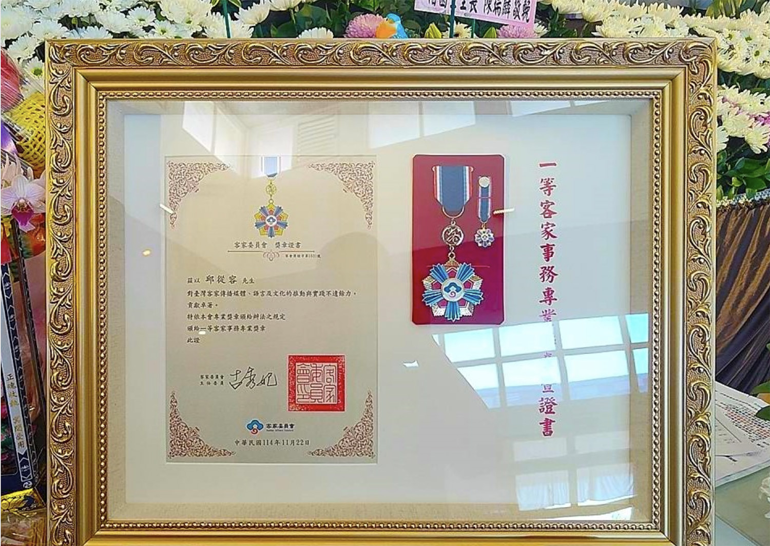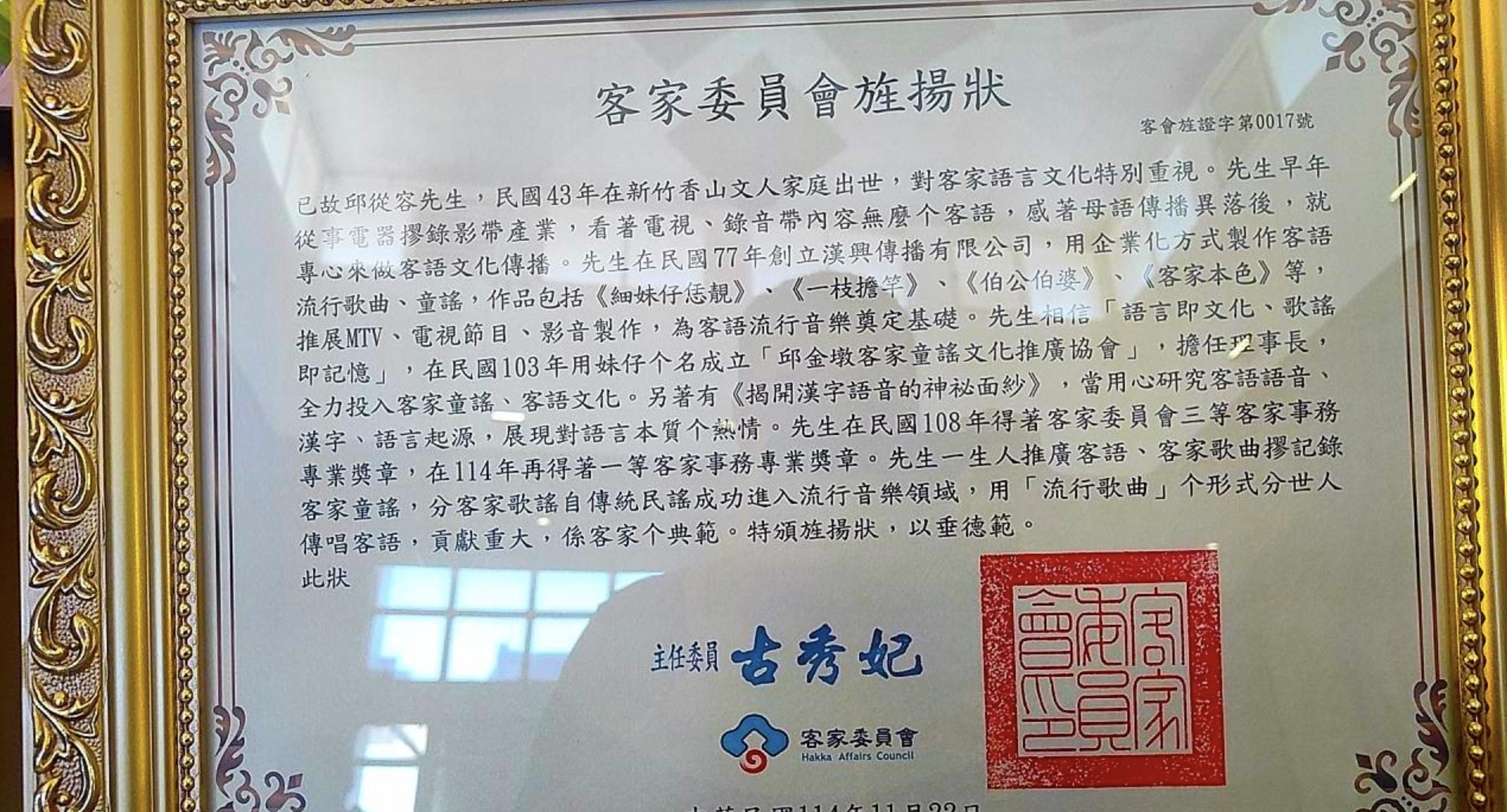 多年來,無論在客語流行音樂、童謠創作或語言推廣上,邱從容先生始終以行動守護母語,使客語在不同世代之間延續流傳。其長期投入深獲客委會肯定,曾於2019年獲得「客家事務三等專業獎章」,今年再得到一等客家事務專業獎章。客委會感謝先生一生的奉獻,特於昨日頒贈旌揚狀,以表對其敬意與懷念。