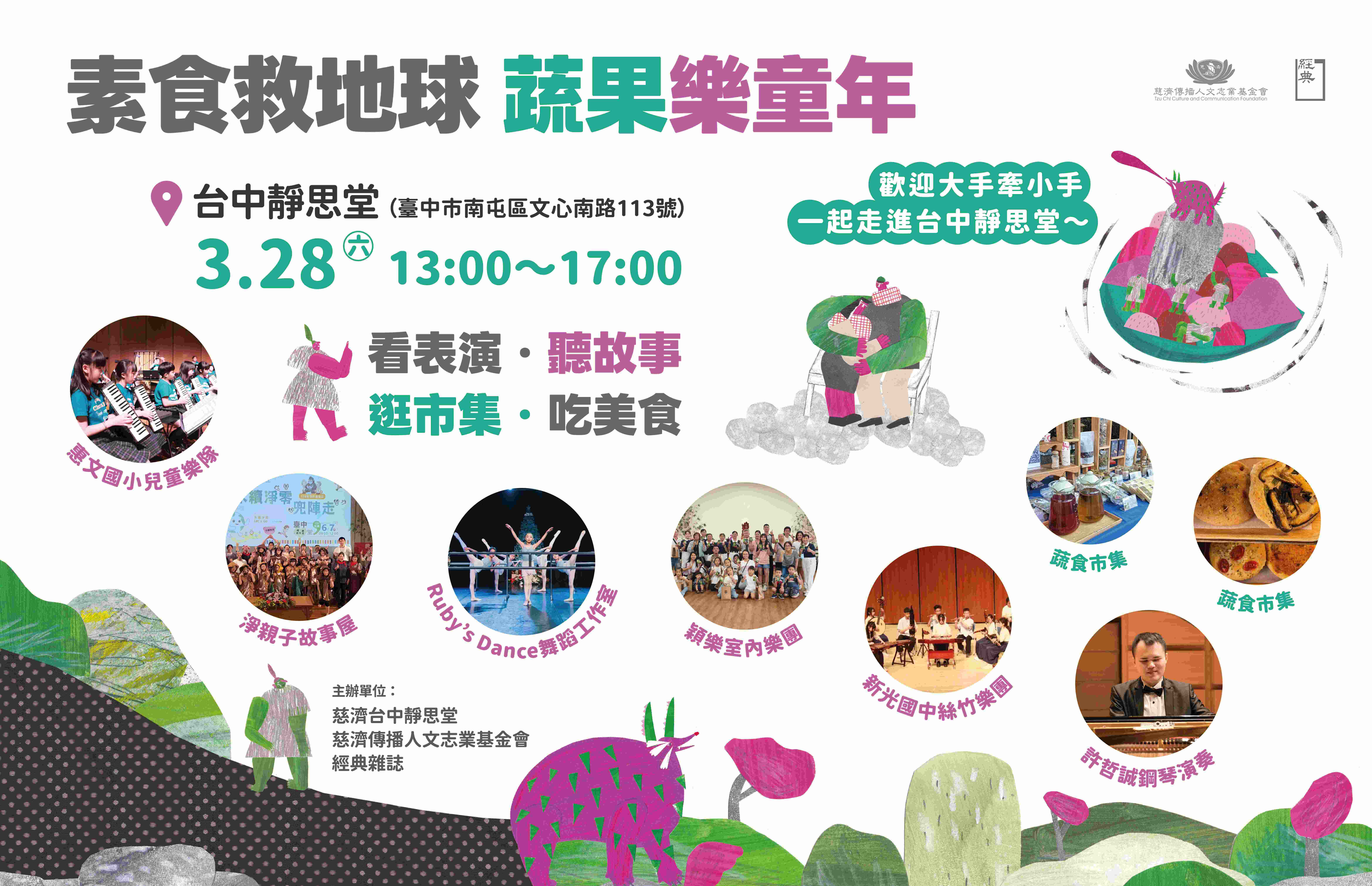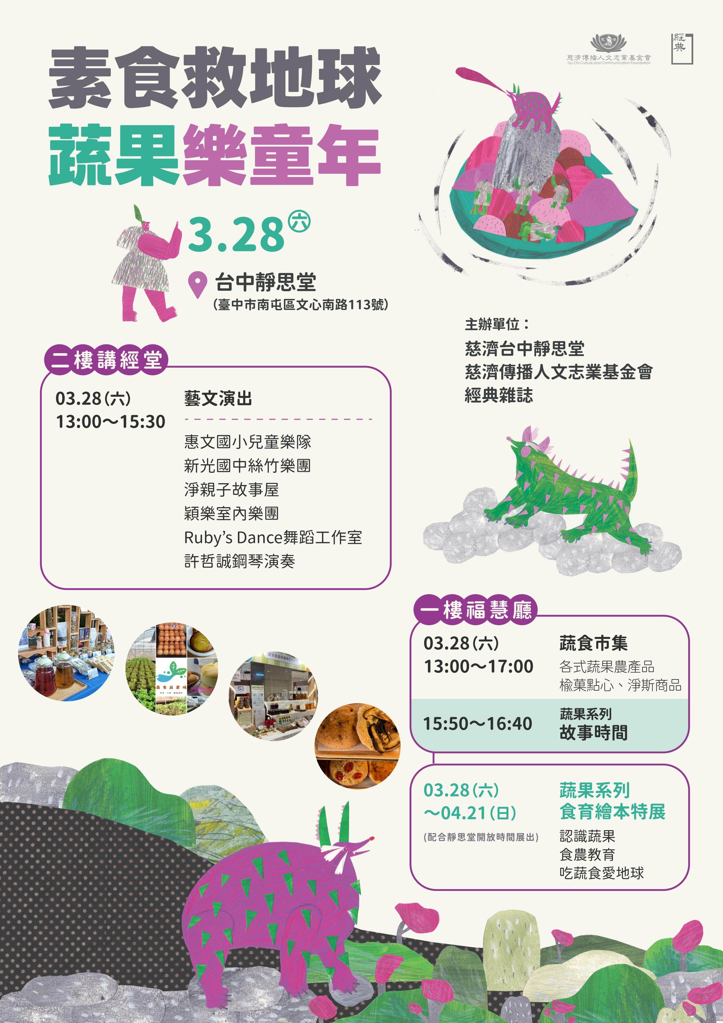 為了推廣永續飲食,讓更多人吃得健康,同時友善環境,慈濟台中靜思堂與慈濟傳播人文志業基金會將於本週六(3/28)舉辦「素食救地球.蔬果樂童年」活動,邀請多組藝文團體熱鬧開演,結合蔬食市集與食育繪本特展,現場還有親子同樂的小遊戲與故事講座,歡迎家長帶著小朋友蒞臨,開啟一場愛護地球的綠色實踐,開幕首日還能獲得與蔬食有關的繪本,數量有限,送完為止。