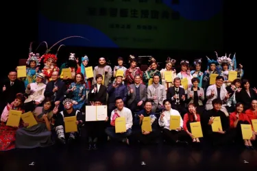 4年功成梨園夢 傳藝第1屆結業生邁向成角之路國立傳統藝術中心4日於臺灣戲曲中心小表演廳舉辦「傳統藝術接班人—駐團演訓計畫」結業習藝生授證典禮暨謝師禮記者會,24名結業習藝生齊聚亮相。文化部長李永得親自頒發證書,劇團導師包含一心戲劇團長孫榮輝...