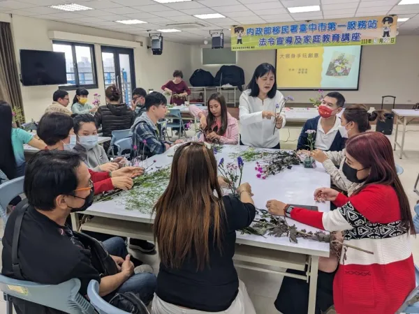 提到插花大家可能會想到花材昂貴,技巧困難,好像專屬於貴婦跟花藝專家。內政部移民署臺中市第一服務站邀請到社團法人臺灣樂齡愛幼教育協會陳雪嬌理事長,示範連新手也可以在家嘗試的插花藝術,帶著新住民夫妻發揮...
