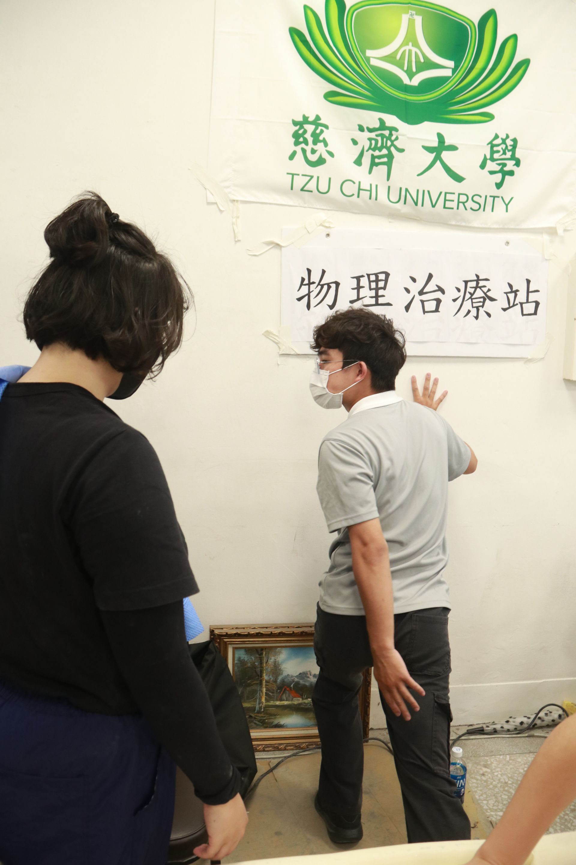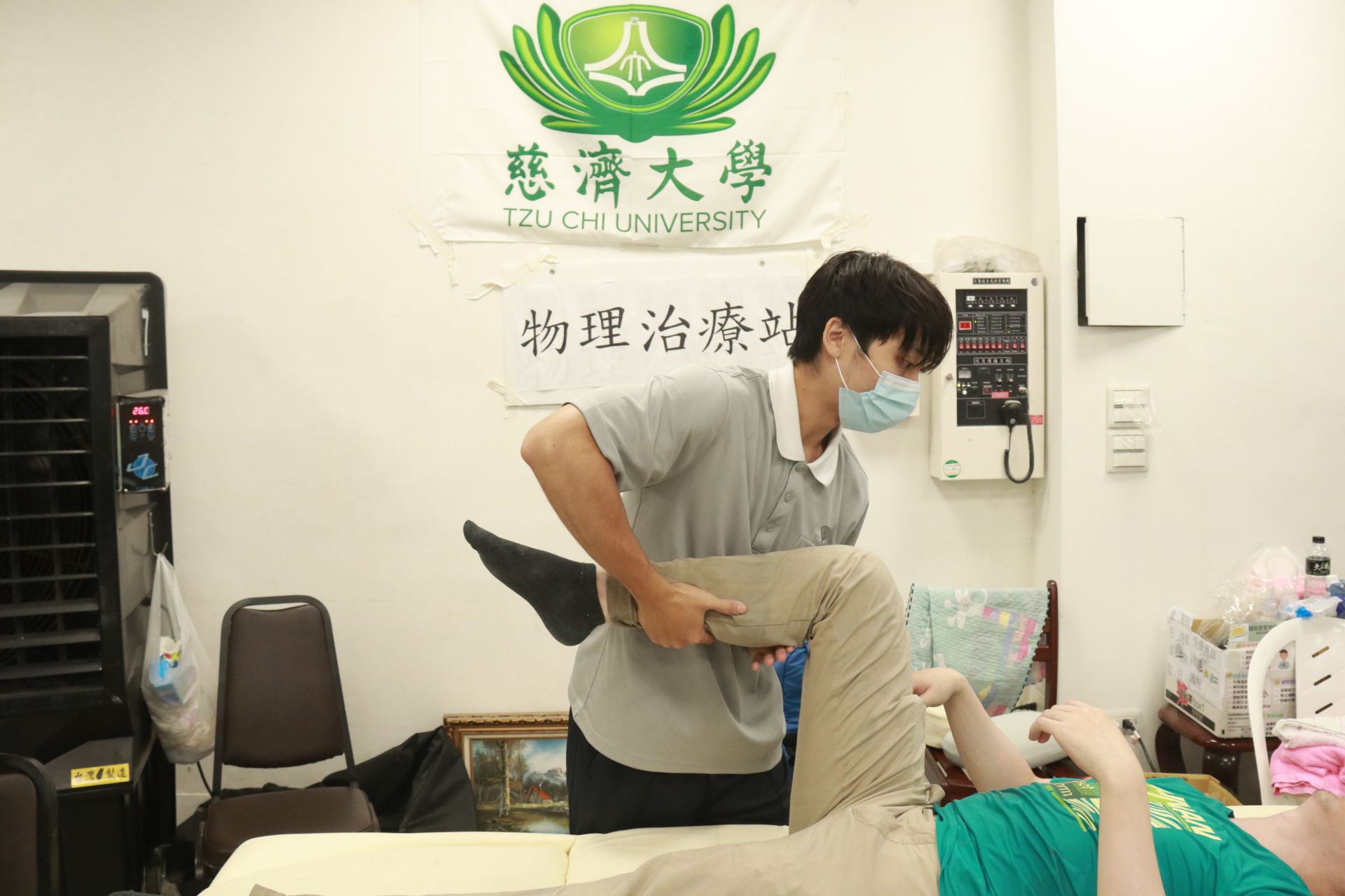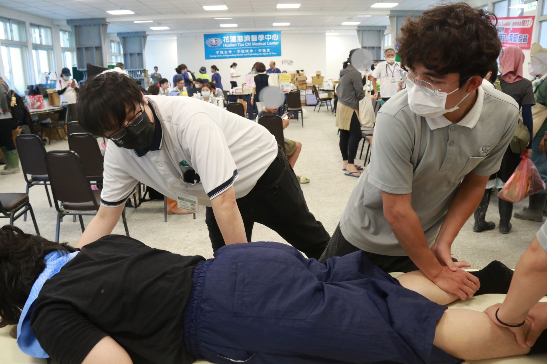 現場服務的學生是已經考取執照的物理治療師。他們能問診、治療,並提供衛教。有幾位同學,甚至前幾天是「鏟子超人」跟著志工清淤,今天變身為「復健超人」。連續排班五天的物理治療學系碩士班學生張子明說:「在鏟泥土的過程中蠻吃身體的力,所以知道醫療站有這個需求,就來幫忙。」物治系碩士班學生林怡婷說:「因為自己清理過,所以能夠清楚他們可能是哪裡不舒服。」