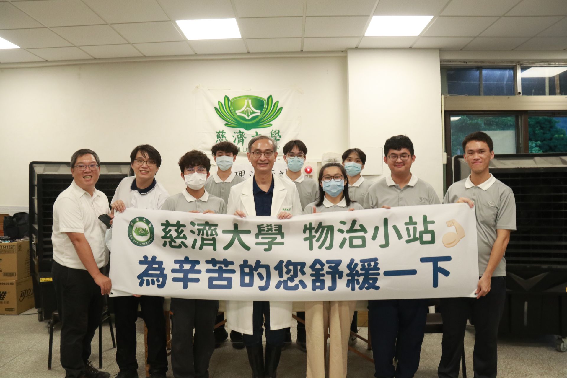 災後的光復,到處都能看到揮汗奮戰的「超人」身影──有鏟子超人、雨鞋超人、怪手超人、國軍超人、水電超人等.....。大家各盡所職協助光復重建,10月1日至5日,慈濟大學物理治療學系師生成立「物治小站」,進駐花蓮慈濟醫院光復糖廠醫療站,早上9點到晚上9點,12小時不間斷服務超人們。