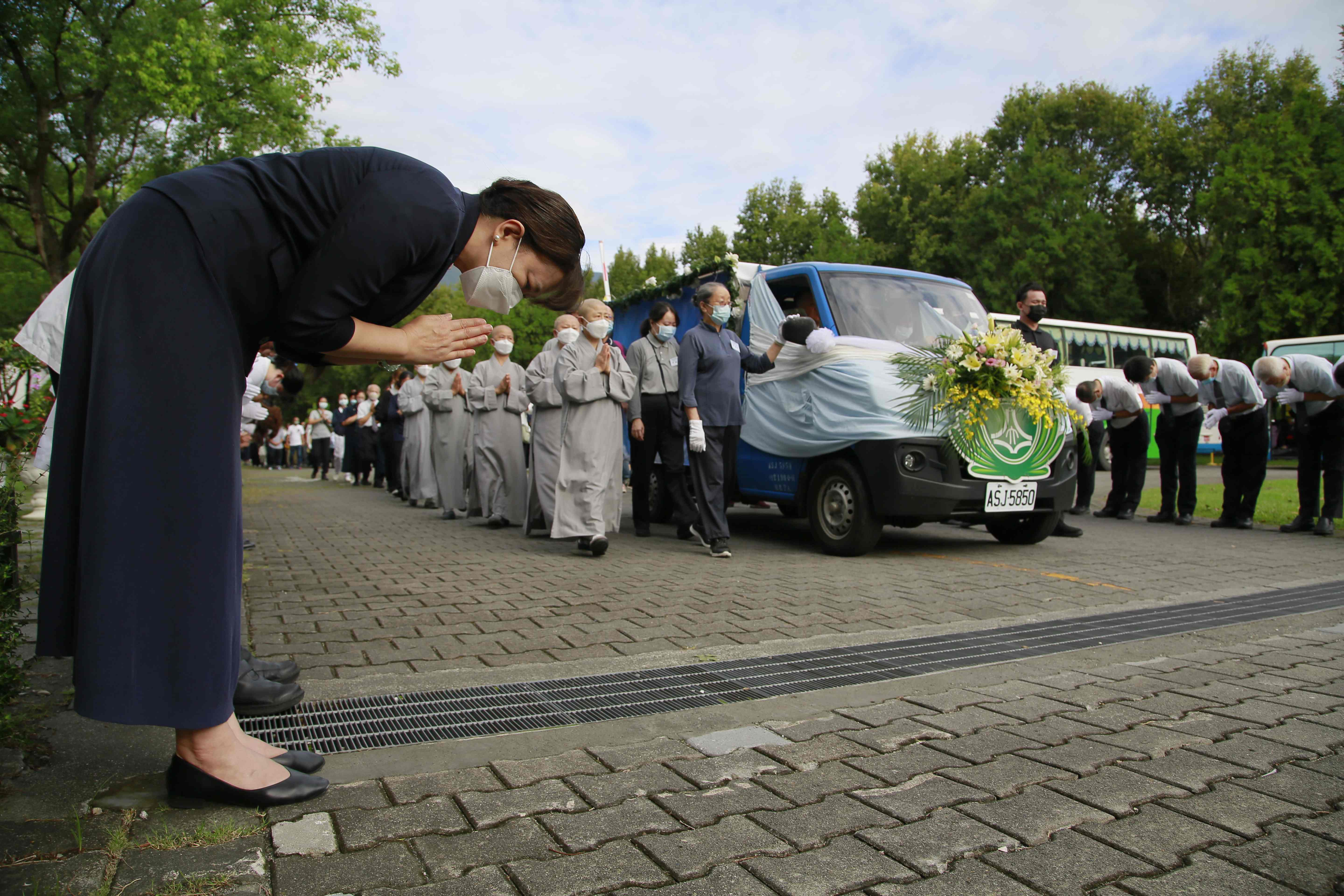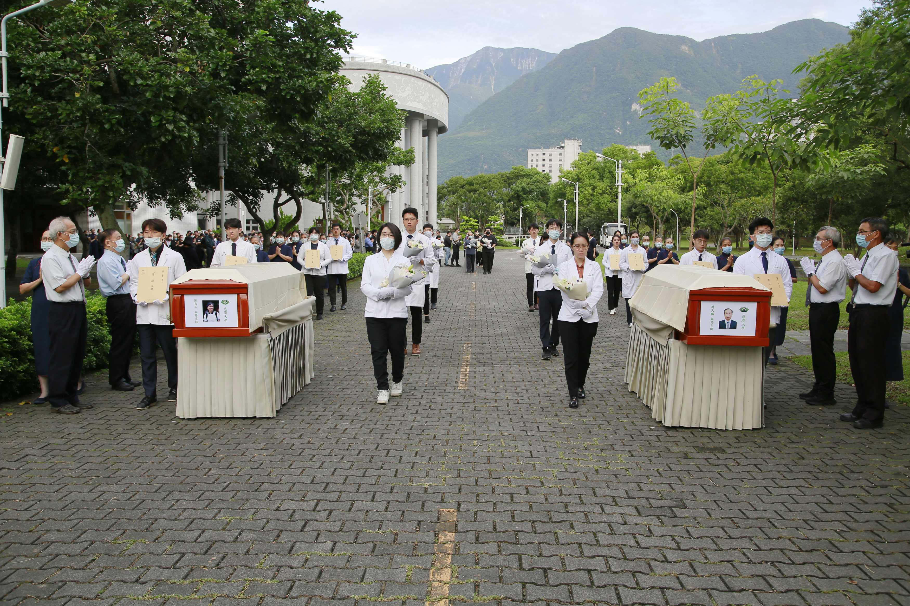 八位無語良師為周大鵬老師、陳宿芬老師、葉容君老師、張香花老師、陳俊全老師、張君令老師、上德下昭法師、莊呂秋妹老師。今天在靜思精舍師父的引禮下,慈大劉怡均校長,醫學會醫師以及家屬們,深深一鞠躬送別老師。劉怡均校長致詞表示,各類超人們到光復洪災現場協助,這是全世界沒有的志工文化,台灣有一群很善良的人,就像八位無語良師一樣,生前幫助別人,往生後奉獻給醫學教育。