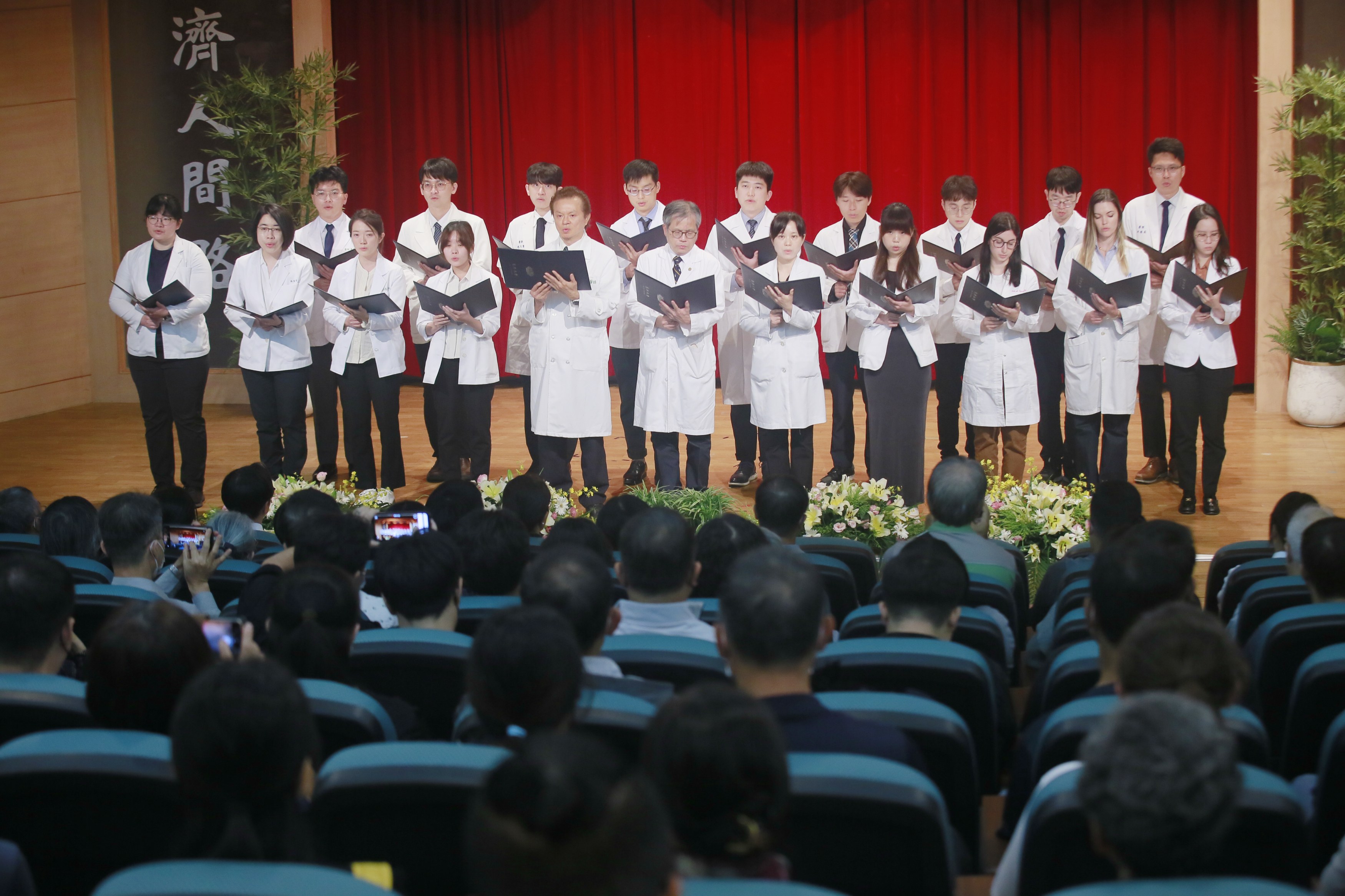 由醫學會理事長帶領醫師們合唱「感恩的心」,劉怡均校長致贈感恩紀念牌給予家屬。德宇師父開示,八位無語良師往生時目標確定,無有恐懼,今天所有老師圓滿心願,但他們的大捨大愛將透過醫師的手,讓愛延續。
