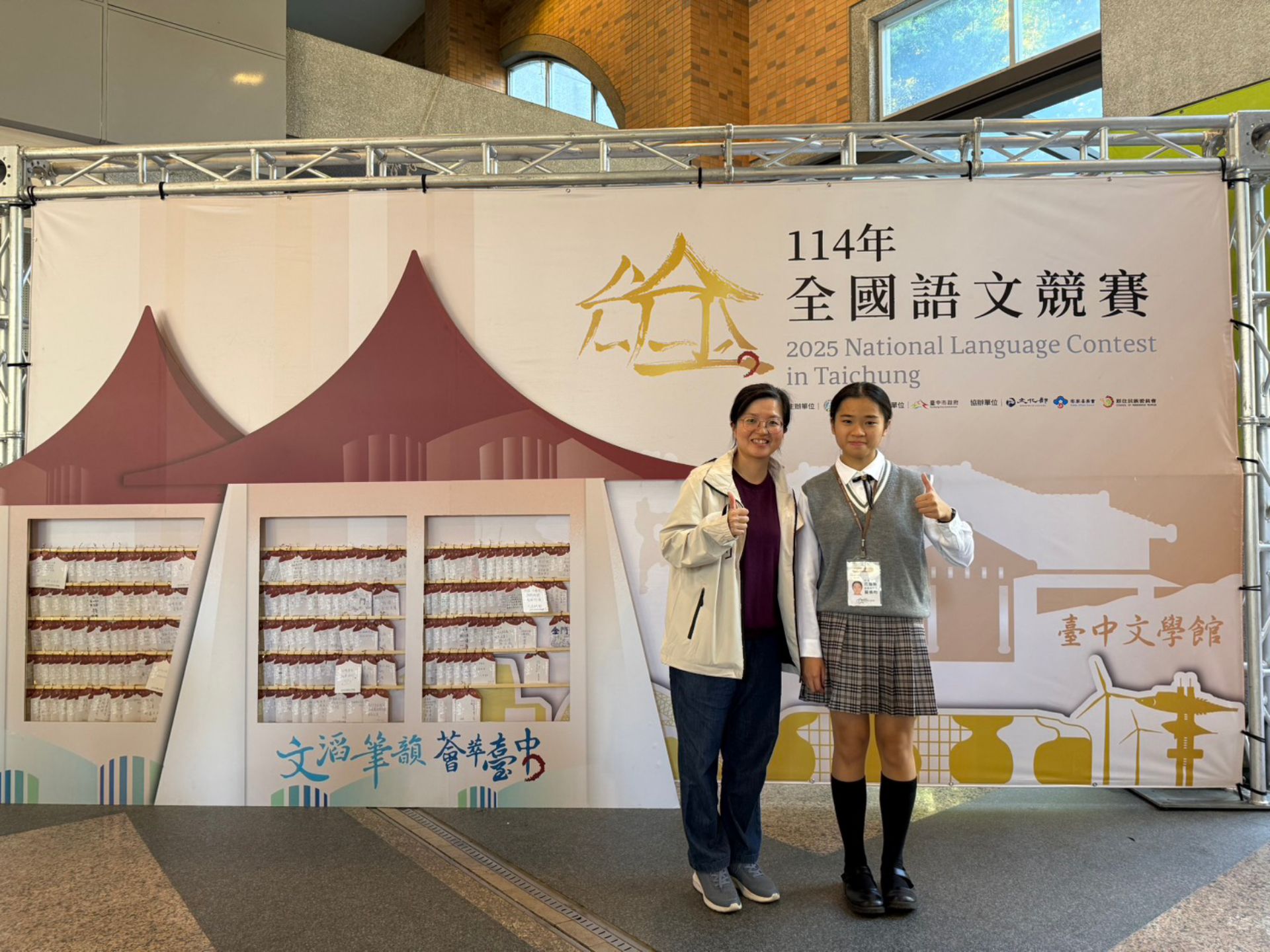 國三羅晨昀同學此次在國語演說項目中奪下優等佳績。她表示,能參加全國語文競賽是一次非常珍貴的經驗。比賽中抽到自己擅長的題目,讓她能以更自在的狀態分享觀點。她認為每一次站上舞台都是成長的一部分,也讓自己成為更有故事、更加自信的人。羅晨昀同學也特別感謝林惠瑩老師一路以來的指導與陪伴,讓她能帶著勇氣與自信站上全國舞台。未來仍希望持續挑戰全國舞台,展現更成熟、更加穩健的自己。