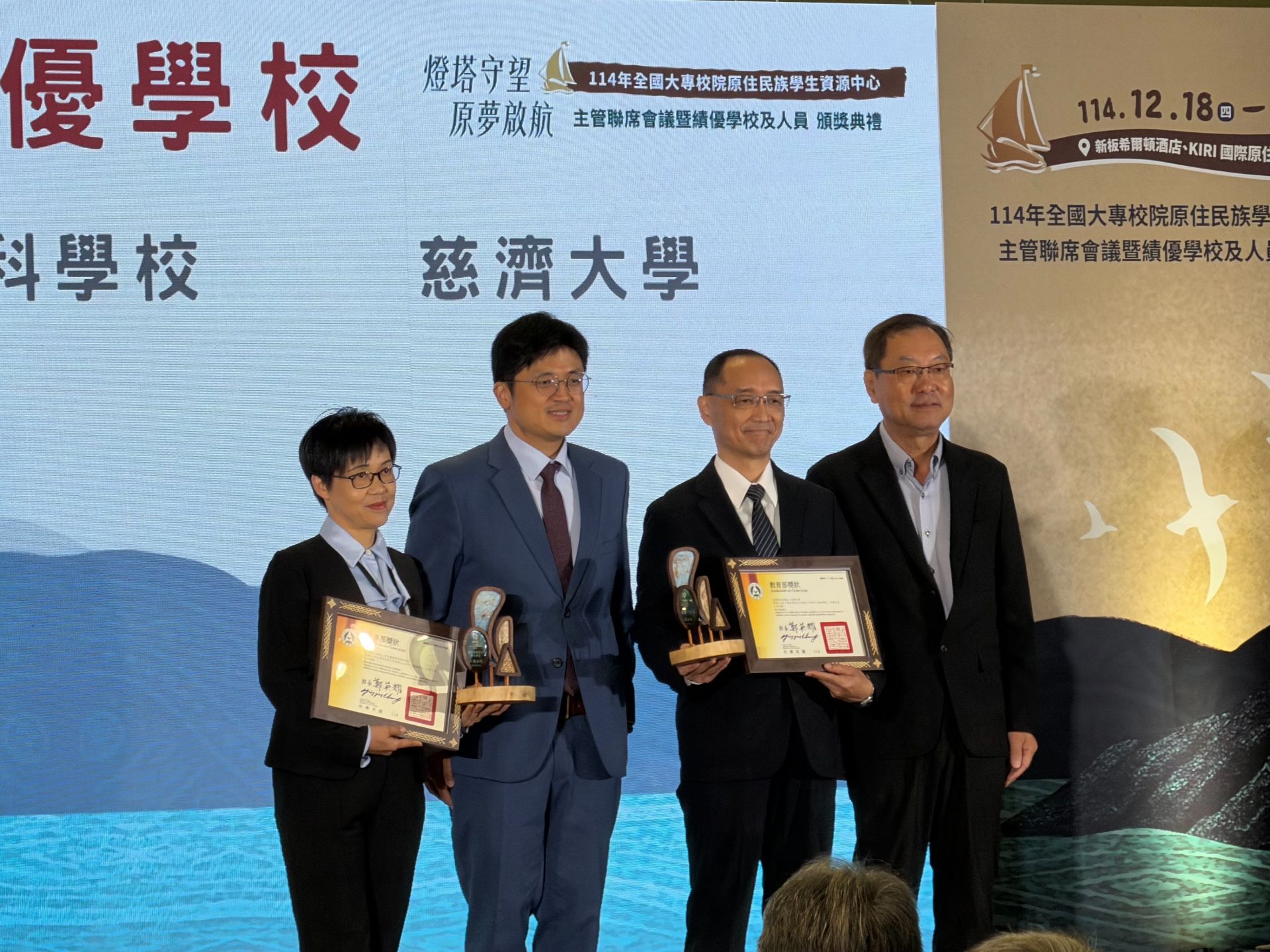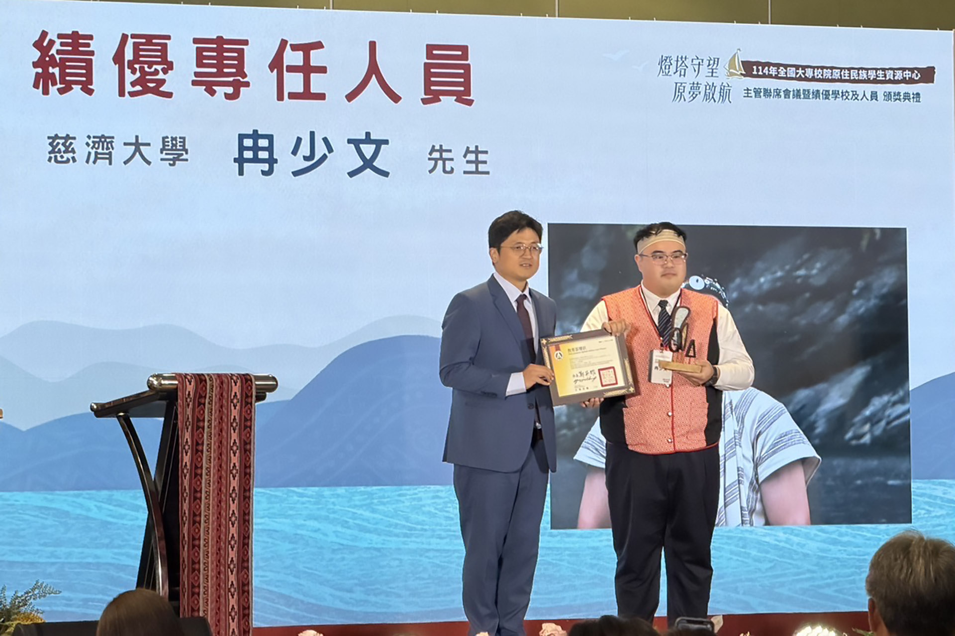 教育部今天舉辦114年全國大專校院原住民族學生資源中心主管聯席會議暨績優學校及人員頒獎典禮,慈濟大學原住民族學生資源中心多年深耕原住民族學生輔導與文化推廣的努力,榮獲114年績優學校,中心同仁冉少文並獲得「績優專任人員」,慈大原資中心從學業、生活、職涯、文化等全方位支持為原住民族學生,打造安心就學的環境,讓學生感受到「家的支持」。
