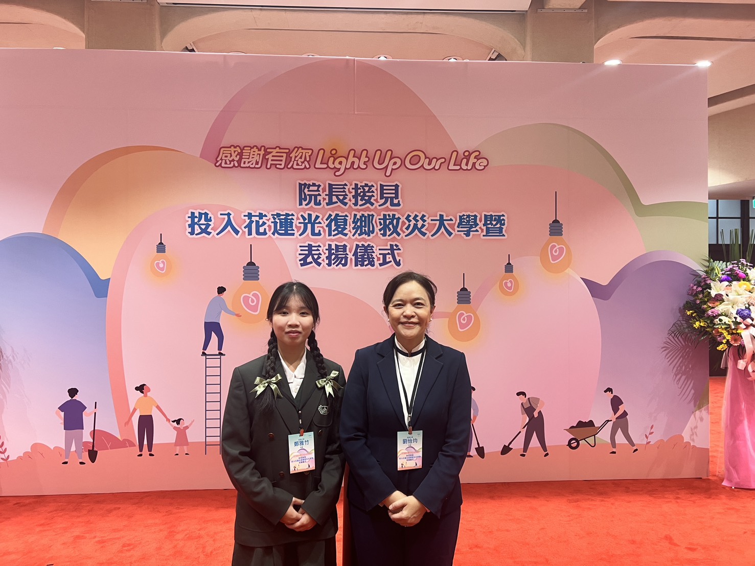 在光復鄉遭洪災重創後,慈濟大學超過697人次 師生同仁挺身而出,投入救災。26日,行政院舉辦「投入花蓮光復鄉救災大學暨表揚儀式」,慈濟大學劉怡均校長與護理科五專部五年級鄭雅竹同學代表慈大鏟子超人出席,並由行政院卓榮泰院長頒發感謝狀,表揚慈濟大學在洪災後投入災區復原,以及師生發揮專業協助的精神。