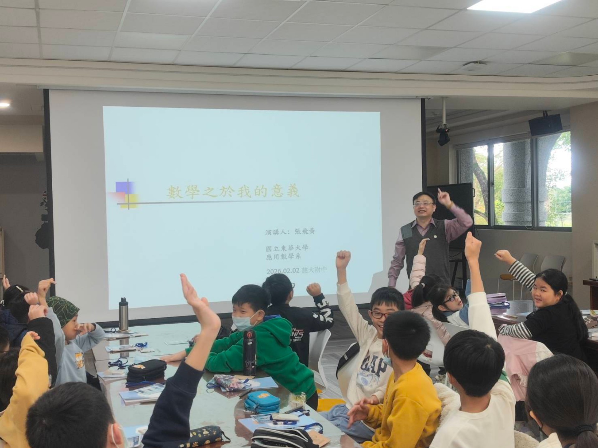 上午課程由東華大學應用數學系主任張飛黃教授揭開序幕。他以「數學之於我的意義」為題,藉由拼圖挑戰激發國中生的邏輯思考。他將數學比喻為「大腦的重訓」,強調邏輯可透過鍛鍊強化,並勉勵學生提升自學比重至六成以上,指出保持主動質疑的態度比標準答案更重要。課堂中更以「生日悖論」實測,用直覺與機率的落差,帶領學生領略數學奧祕。