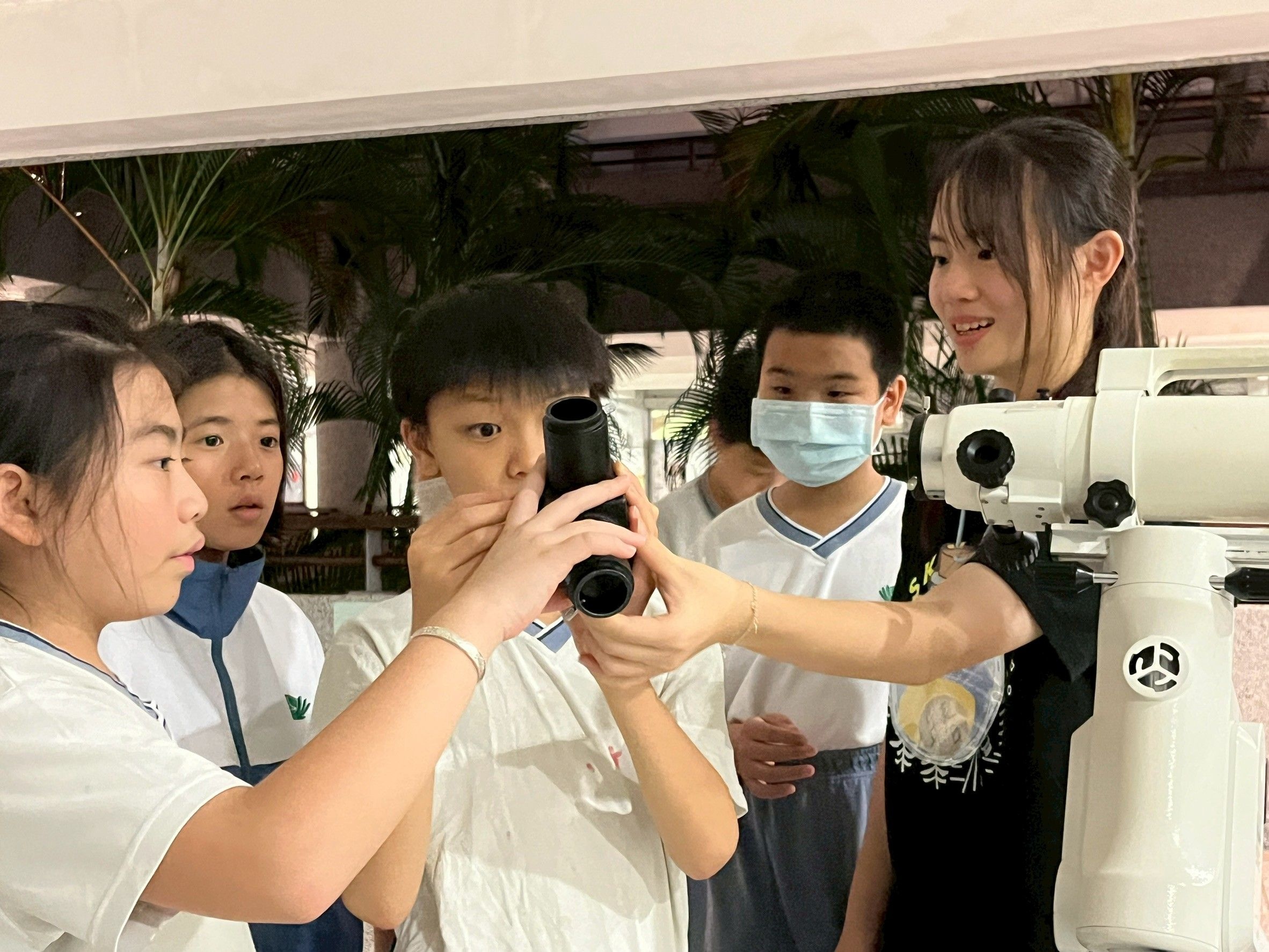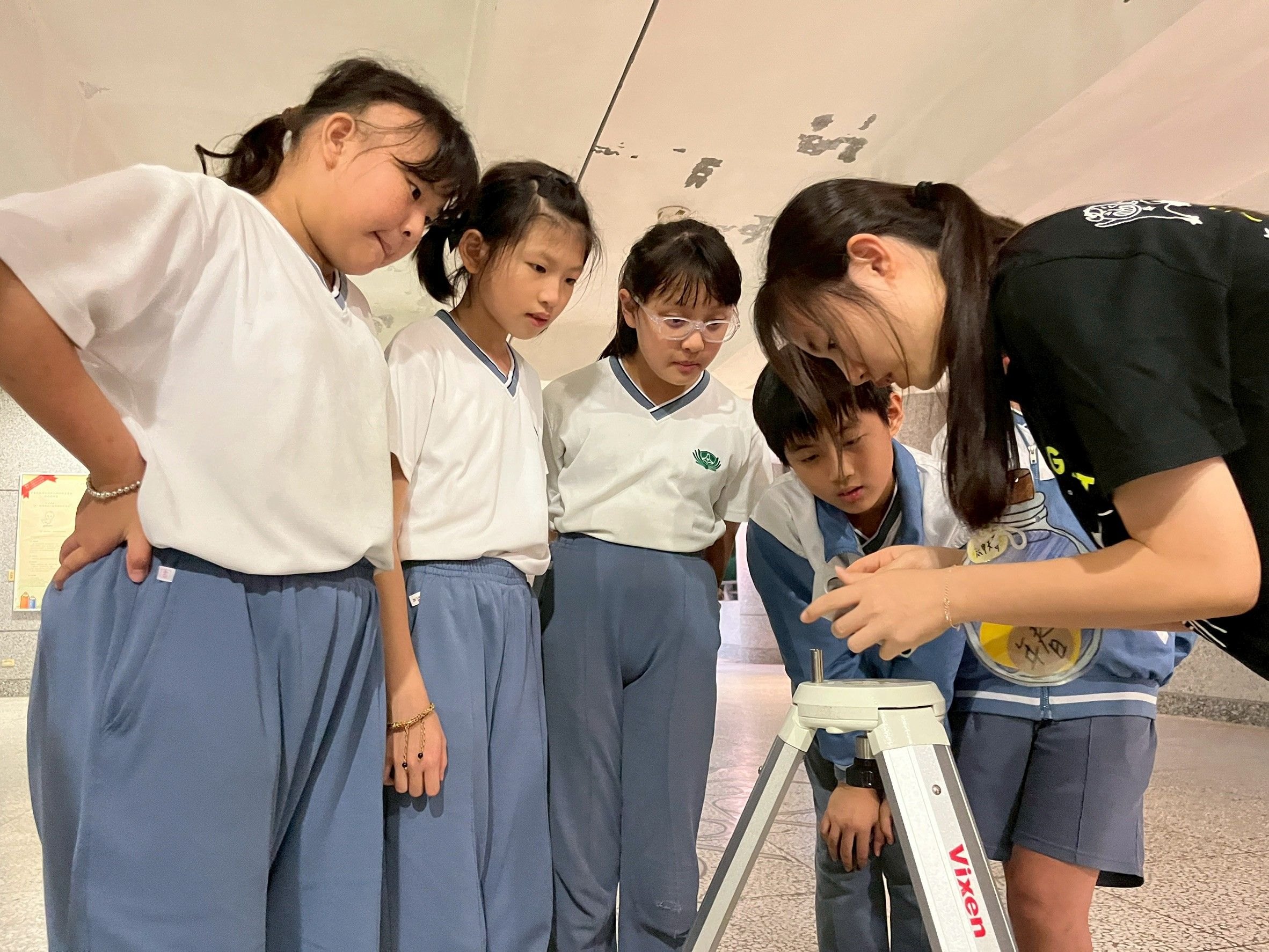 營隊的高潮落在「望遠鏡組裝」環節。孩子們屏氣凝神,從架設腳架、調整水平到精準安裝主鏡,展現出無比的專注。當他們轉動對焦輪,看著遠方音樂館牆上的圖樣從模糊變得清晰銳利時,現場爆發出熱烈的歡笑與歡呼。這一刻,科學不再是遙不可及的理論,而是透過雙手實踐的成就感。