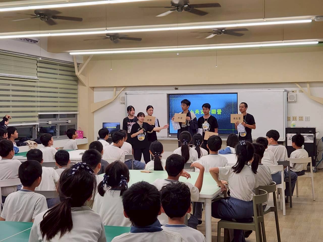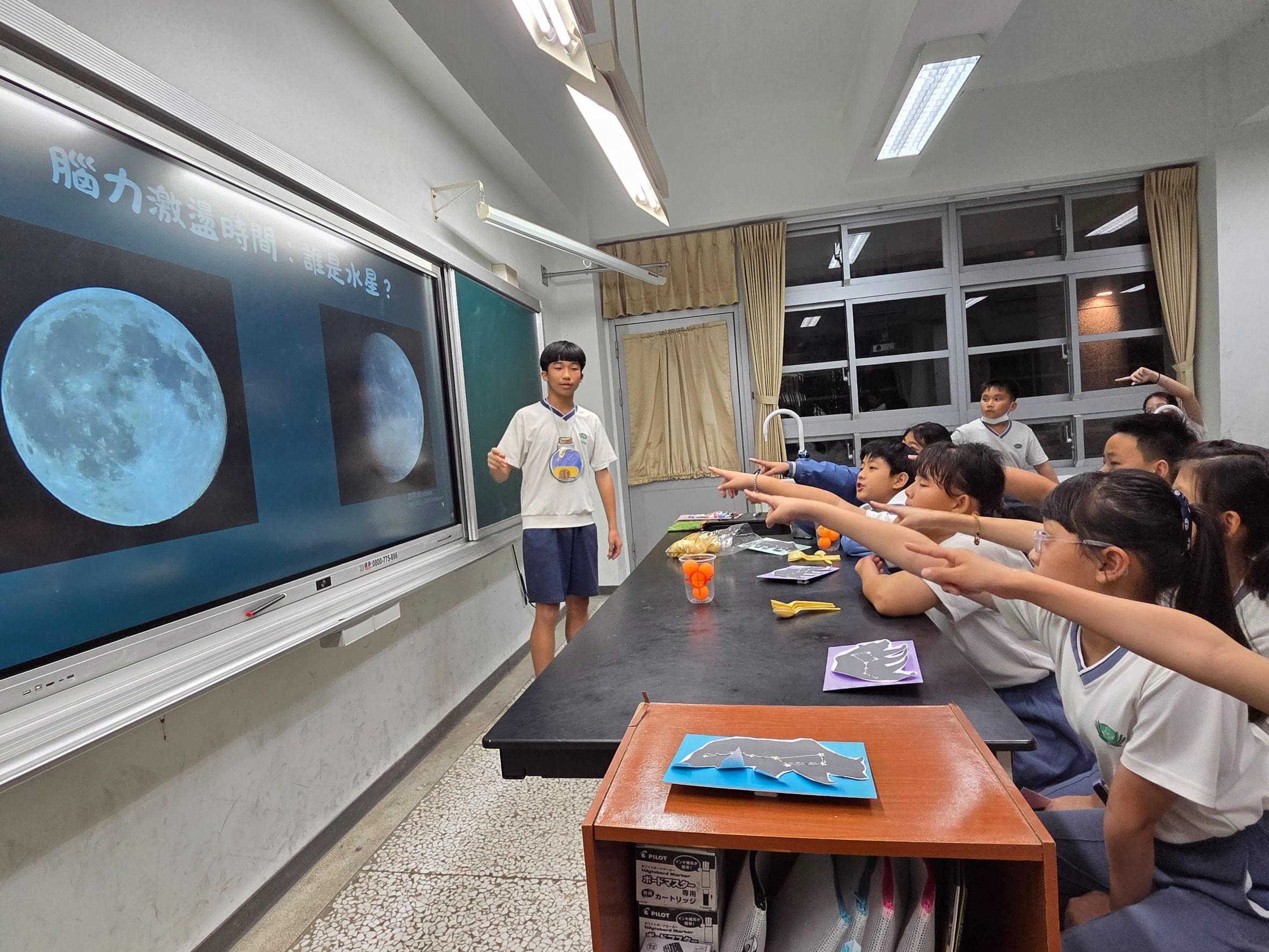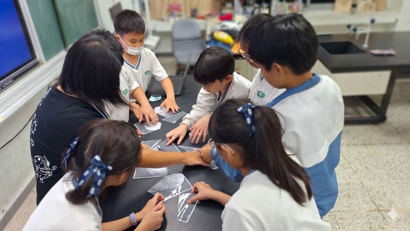 冒險的第一站,孩子們從太陽系八大行星出發。當聽聞被譽為「天文飛毛腿」的水星,繞行太陽一圈竟然只需要 88 天時,現場驚呼聲此起彼落。在高中部學長姐生動的解說下,冰冷的科學數據化作生動的運行規律,讓孩子們的想像力隨之起飛,原本厚重的課本知識,瞬間變成了觸手可及的探索旅程。