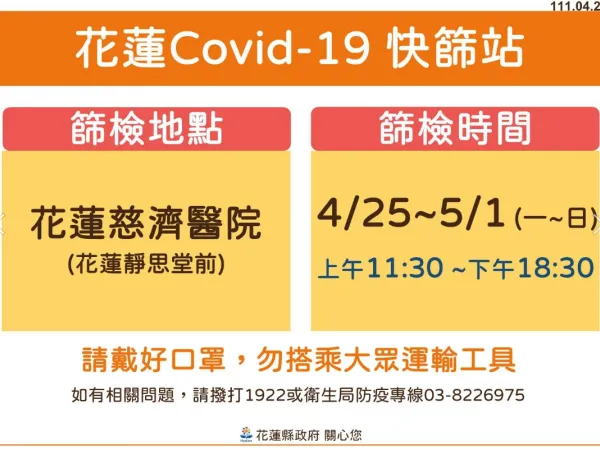 Omicron在社區蔓延的速度相當快速,已有許多民眾的生活和工作深受影響。 花蓮縣衛生局委辦、花蓮慈濟醫院公費快篩站4月25日啟動。 時間:4/25(一)-5/1(日) 11:30-18:30 地點:靜思堂道侶廣場前(花蓮縣消防局對面) 因考量民眾關切...