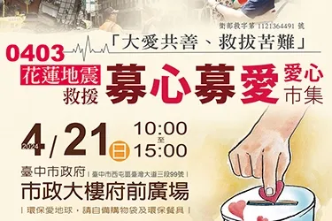 【臺中】0403地震愛心市集大愛共善救拔苦難一起做花蓮鄉親的靠山 中區與市府合辦「大愛共善、救拔苦難」 為救援0403花蓮地震災民早日恢復家園,過正常的生活,慈濟慈善基金會與臺中市政府將於2024年4月21日早上10點至下午15點,於臺中市政府府前廣場舉辦「大愛共善...