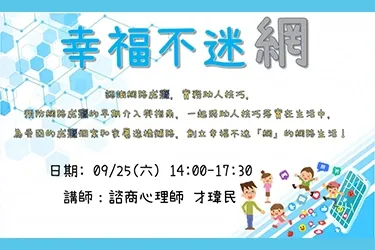 幸福不迷「網」【幸福不迷「網」】 認識網路成癮,實務助人技巧,預防網路成癮的早期介入與指南,一起將助人技巧落實在生活中,為受困的成癮個案和家屬造橋鋪路,創立幸福不迷「網」的網路生活! 日期|9/25(六)時間|14:00-17:30講師|...