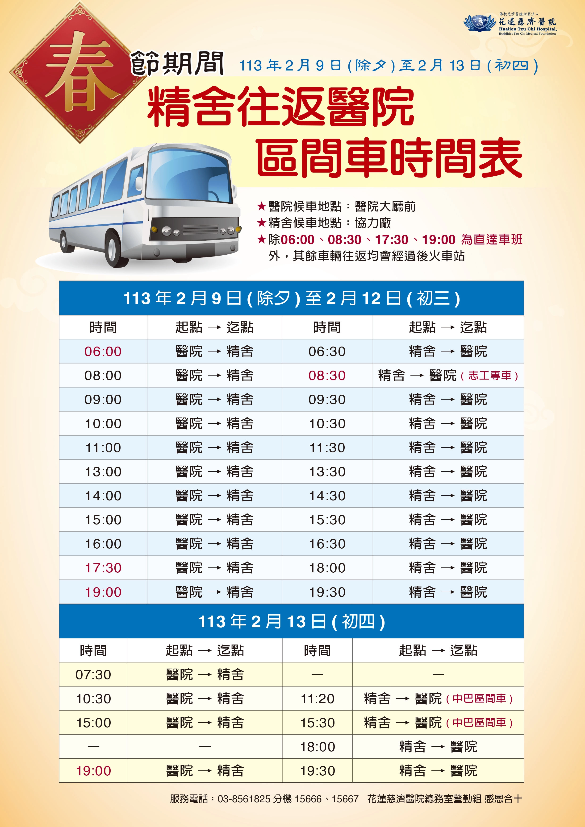 【花蓮】2024年春節精舍往返醫院區間車時刻表 分享好友 2024/02/12 20:00 ( 02/05 11:49更新) 二月適逢農曆春節,精舍往返醫院區間車時刻表。 春節期間:113年2月9日(除夕)至2月13日(初四),精舍往返醫院區間車部分車次為直達車其餘均經後火車站,歡迎多加利用搭乘。 登入後可以閱讀全文 關鍵字: 花蓮 花蓮慈濟醫院 靜思精舍 分享好友 喜歡我們的文章嗎?歡迎加入慈善新聞網