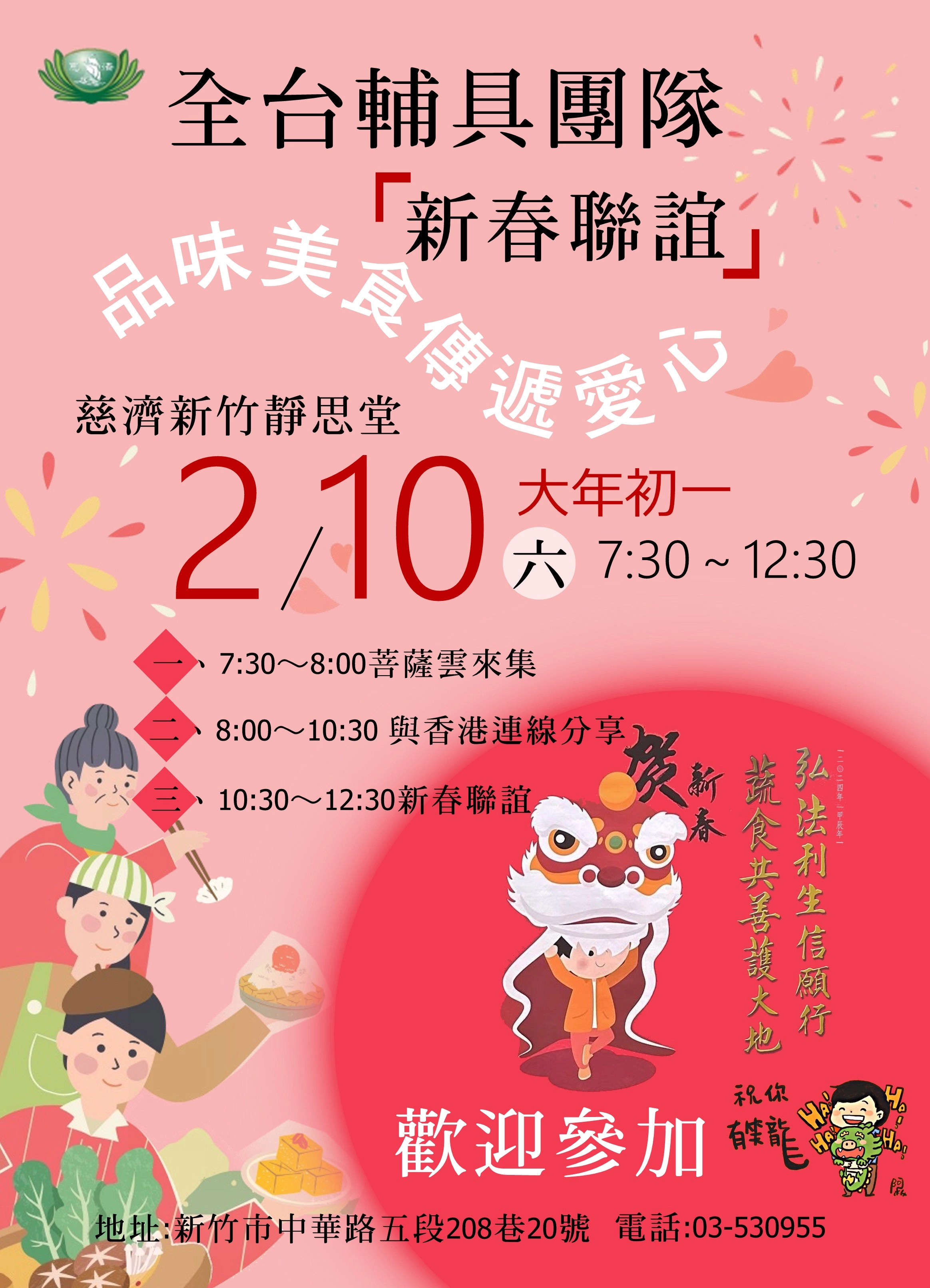 【新竹】全台輔具團隊「新春聯誼」 分享好友 2024/02/07 20:00 ( 02/05 11:48更新) 全台輔具團隊「新春聯誼」品味美食傳遞愛心慈濟新竹靜思堂地址:新竹市中華路五段208巷20號電話:03-530955 2/10 大年初一(六) 7:30~12:30 7:30〜8:00菩薩雲來集 8:00~10:30與香港連分享 10:30~12:30新春聯誼 登入後可以閱讀全文 關鍵字: 新竹 輔具 分享好友 喜歡我們的文章嗎?歡迎加入慈善新聞網