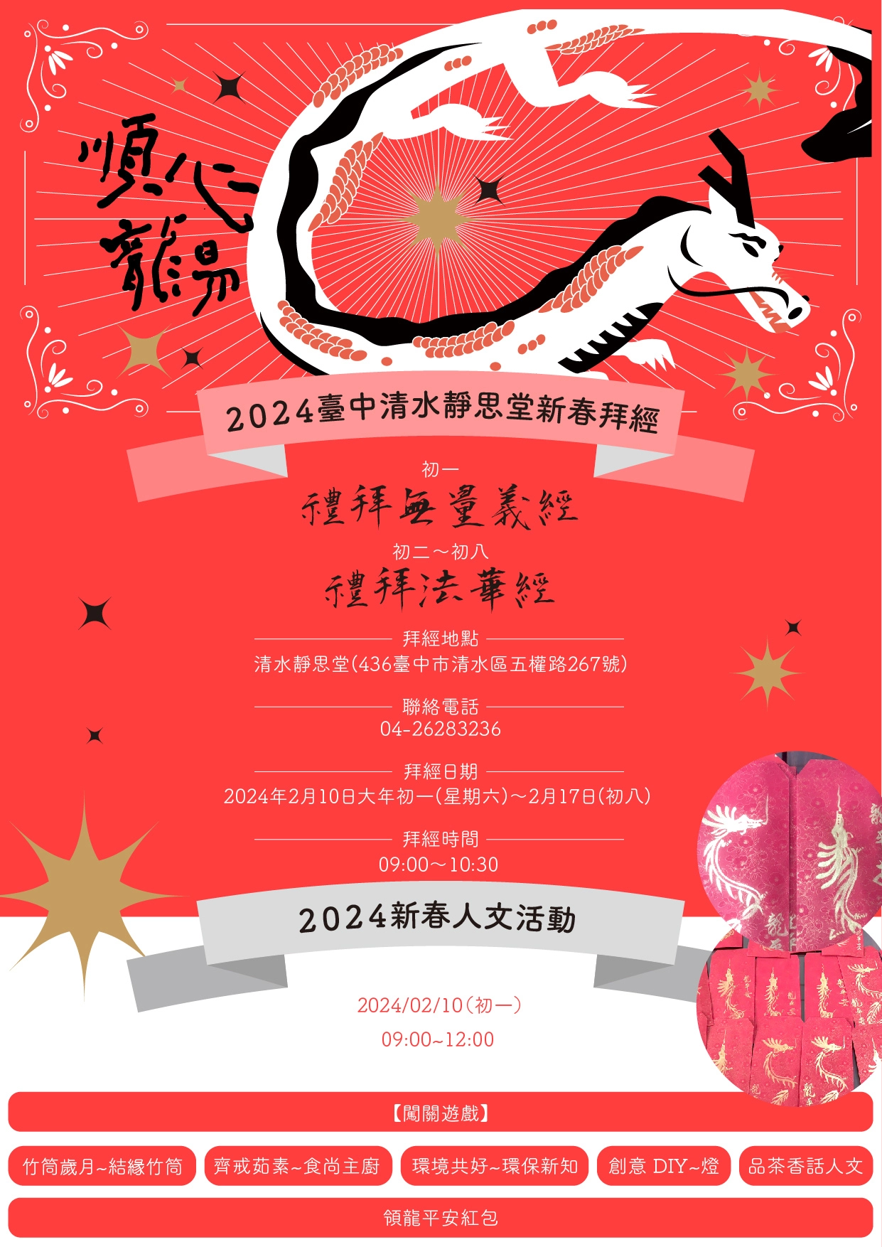 【臺中】清水靜思堂 新春拜經 分享好友 2024/02/06 20:00 ( 02/05 11:48更新) ▲臺中清水靜思堂(436台中市清水區五權路267號 04-26283236) 時間:2024年2月10日大年初一(星期六)~2月17日(初八) 09:00~10:30 禮拜無量義經(初一) 禮拜法華經(初二~初八) 新春人文活動2024/02/10【初一】09:00~12:00 活動內容-【闖關遊戲】 竹筒歲月~結緣竹筒、齊戒茹素~食尚主廚、環境共好~環保新知、創意 DIY~燈籠、品茶香話人文、法喜分享、領龍平安紅包。 登入後可以閱讀全文 關鍵字: 清水 臺中 分享好友 喜歡我們的文章嗎?歡迎加入慈善新聞網