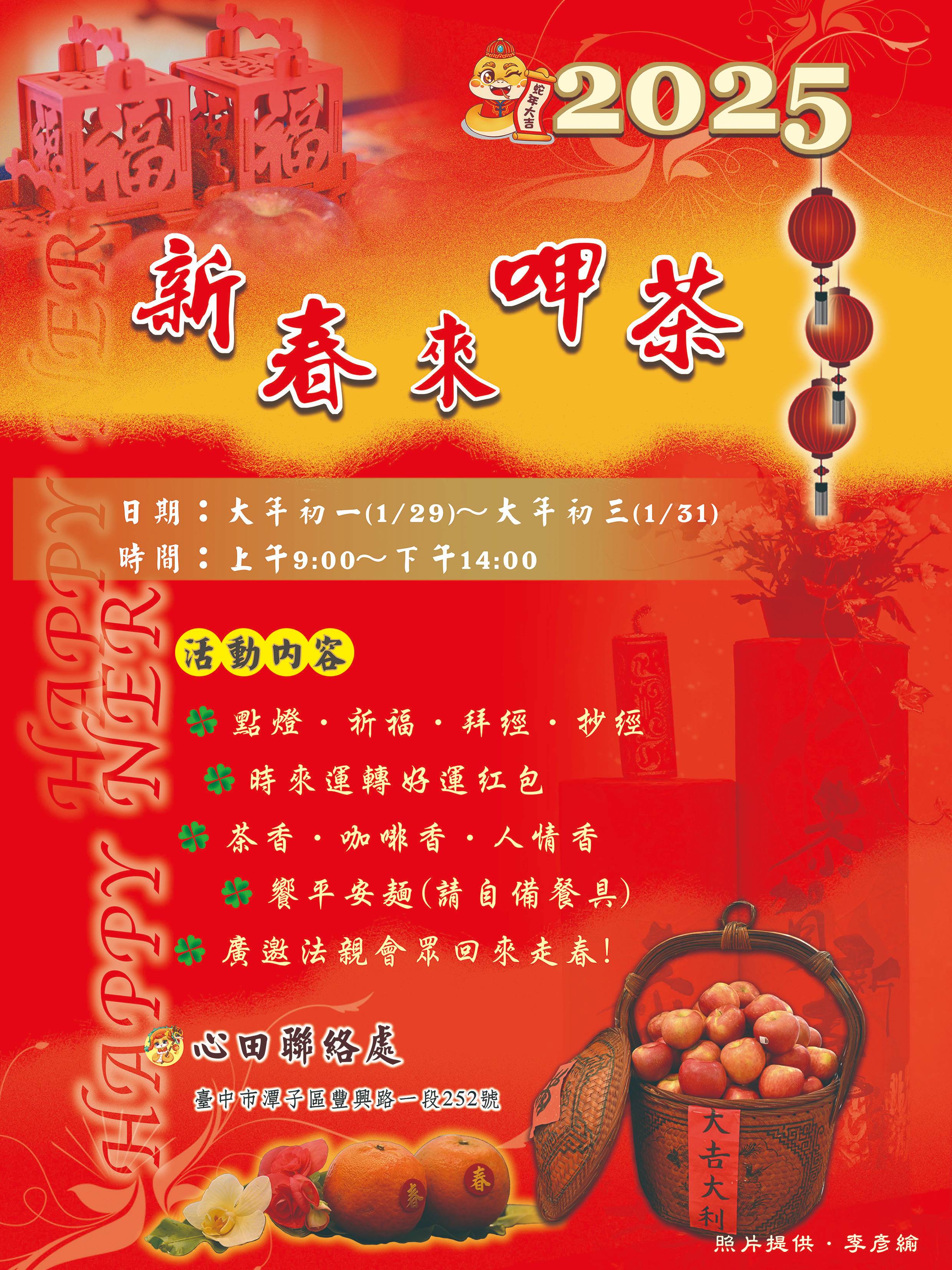 【臺中】心田聯絡處 2025新春來呷茶 分享好友 2025/01/27 08:52 ( 01/23 08:50更新) 日期:大年初一(1/29)~大年初三(1/31) 時間:上午9:00~下午14:00 地點:心田聯絡處(臺中市潭子區豐興路一段252號) 登入後可以閱讀全文 分享好友 喜歡我們的文章嗎?歡迎加入慈善新聞網