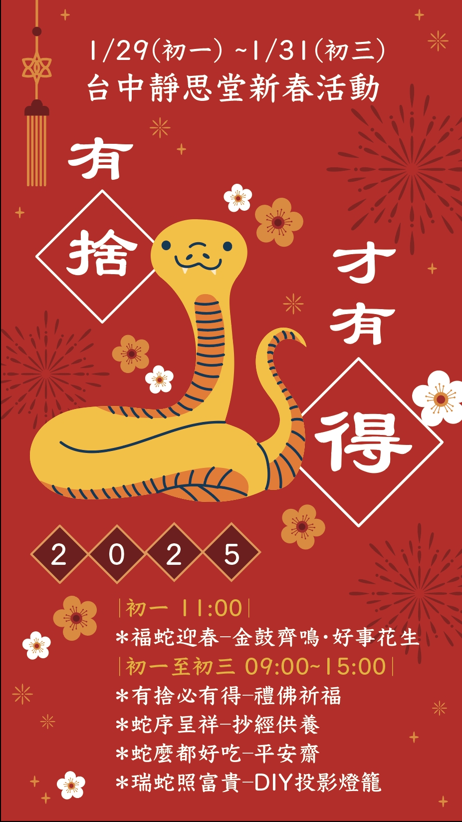 【臺中】臺中靜思堂 新春活動 分享好友 2025/01/27 08:52 ( 01/23 08:50更新) 日期:1/29(初一)~1/31(初三) 時間:09:00-15:00 地點:臺中靜思堂(臺中市南屯區文心南路113號) 登入後可以閱讀全文 分享好友 喜歡我們的文章嗎?歡迎加入慈善新聞網