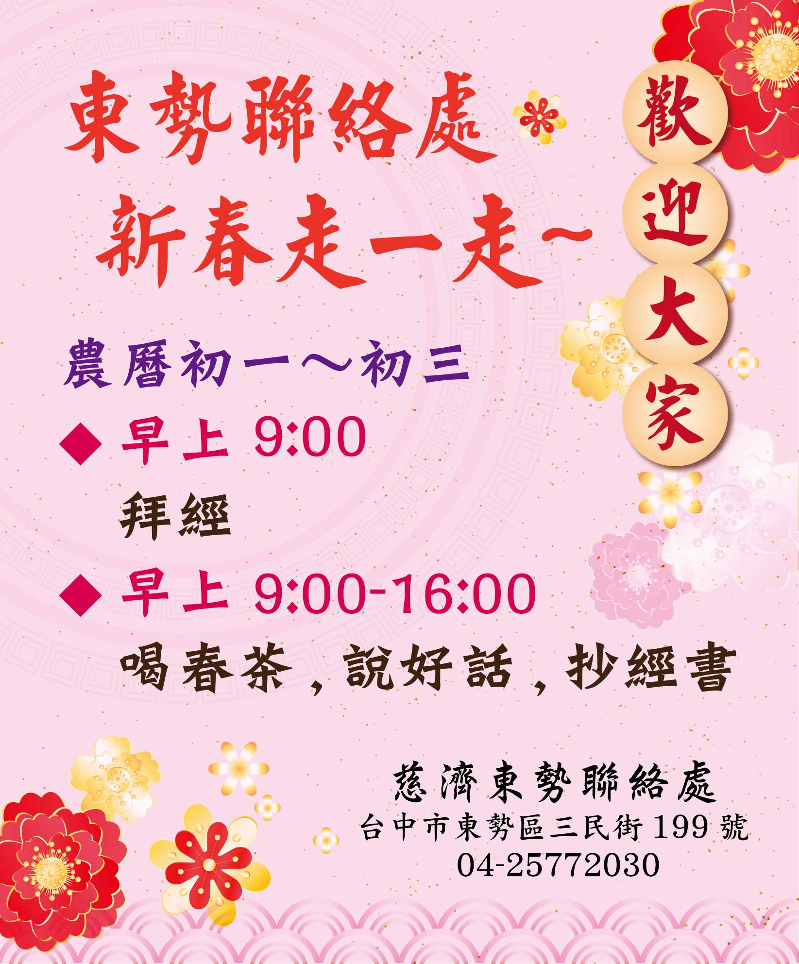 【臺中】東勢聯絡處 新春走一走 分享好友 2025/01/27 08:52 ( 01/23 08:50更新) 日期:農曆初一~初三 時間:早上09:00-16:00 地點:慈濟東勢聯絡處(臺中市東勢區三民街199號) 登入後可以閱讀全文 關鍵字: 臺中 分享好友 喜歡我們的文章嗎?歡迎加入慈善新聞網