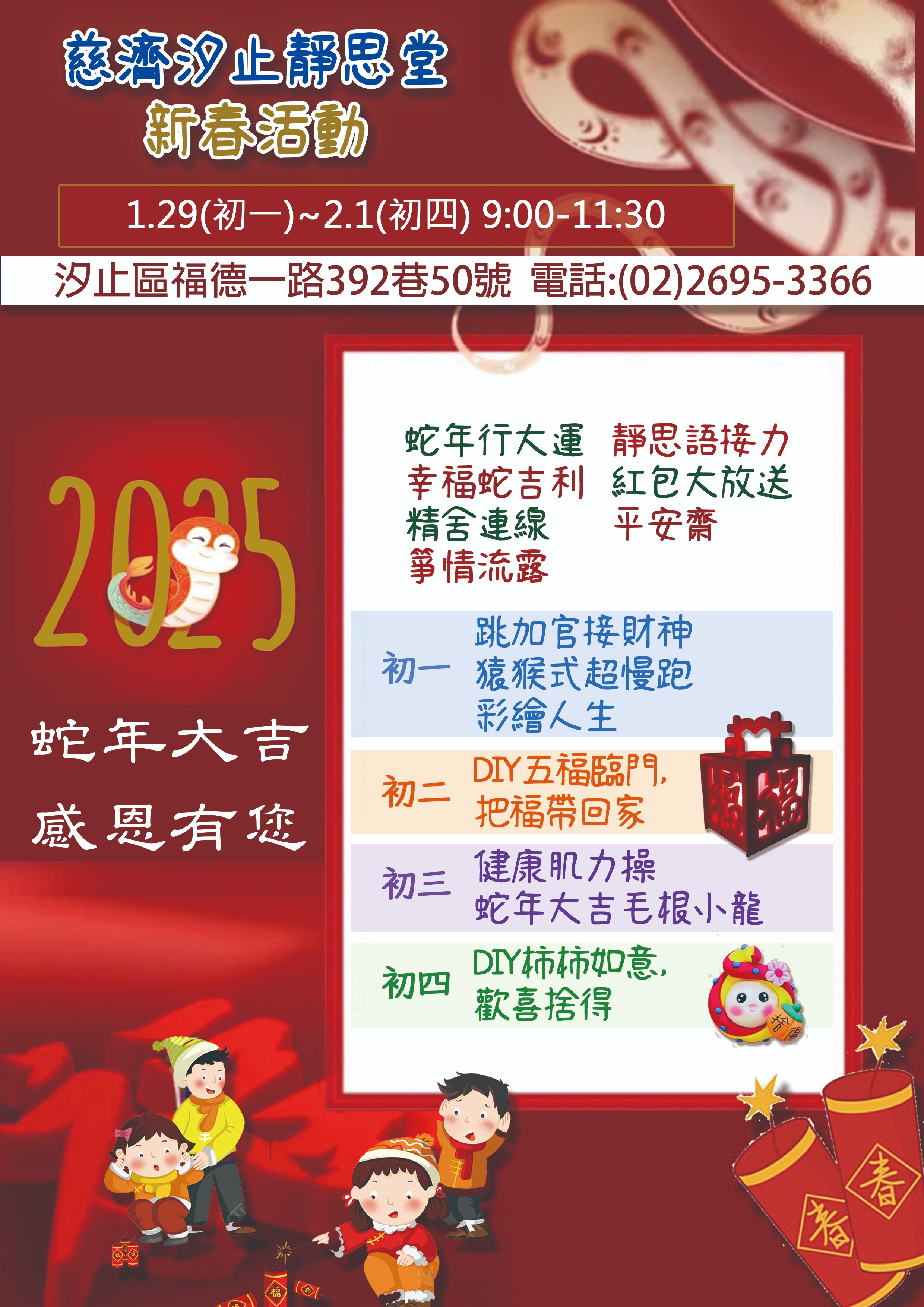 【新北】汐止靜思堂 新春活動 分享好友 2025/01/30 08:49 ( 01/23 08:47更新) 日期:1/29(初一)-2/1(初四) 時間:09:00-11:30 地點:慈濟汐止靜思堂(新北市汐止區福德一路392巷50號) 登入後可以閱讀全文 關鍵字: 新北市 分享好友 喜歡我們的文章嗎?歡迎加入慈善新聞網