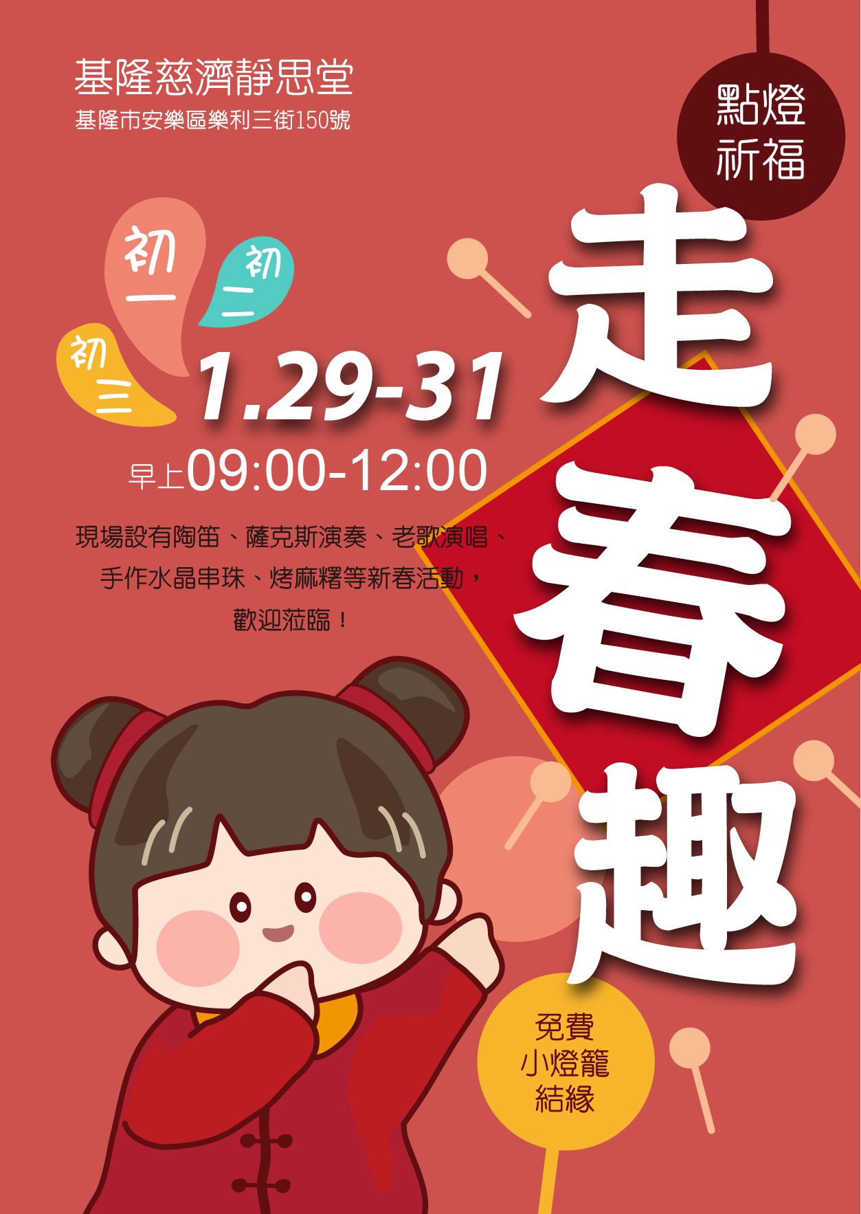 【基隆】基隆靜思堂 點燈祈福走春趣 分享好友 2025/02/01 08:49 ( 01/23 08:47更新) 日期:1/29初一-1/31初三 時間:09:00-12:00 地點:基隆慈濟靜思堂(基隆市安樂區樂利三街150號) 登入後可以閱讀全文 關鍵字: 基隆 分享好友 喜歡我們的文章嗎?歡迎加入慈善新聞網