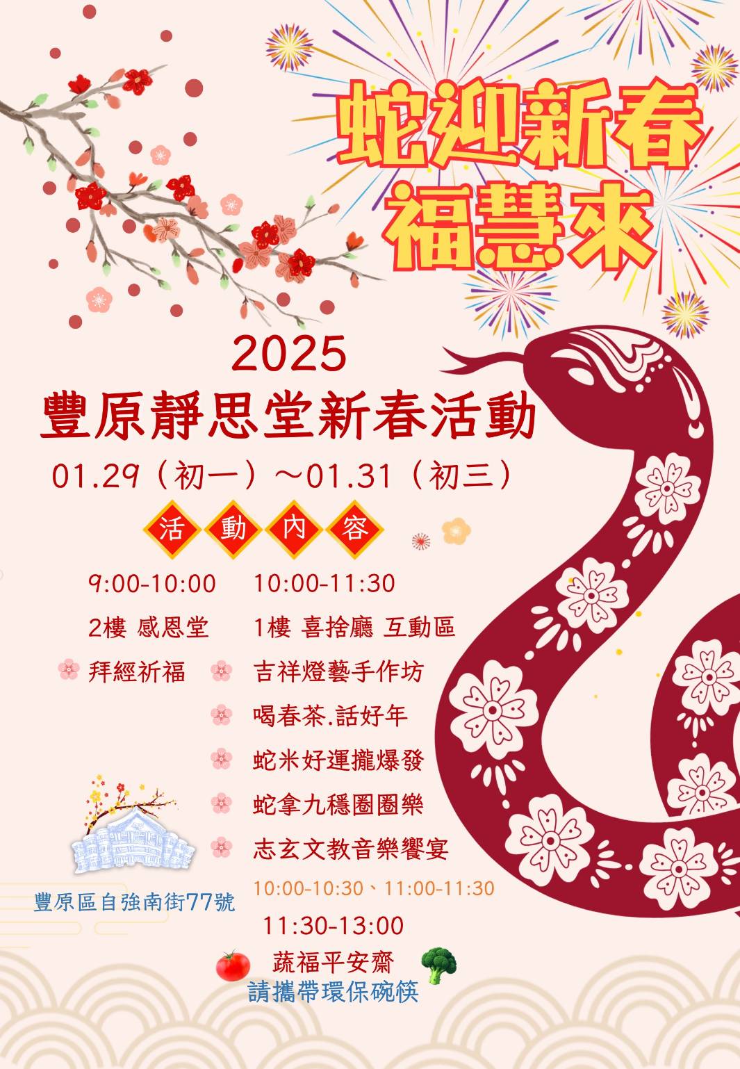 【臺中】豐原靜思堂 蛇迎新春福慧來 分享好友 2025/01/27 08:52 ( 01/23 08:50更新) 日期:01/29(初一)~01/31(初三) 時間:09:00-13:00 地點:豐原靜思堂(臺中市豐原區自強南路77號) 登入後可以閱讀全文 關鍵字: 臺中 分享好友 喜歡我們的文章嗎?歡迎加入慈善新聞網