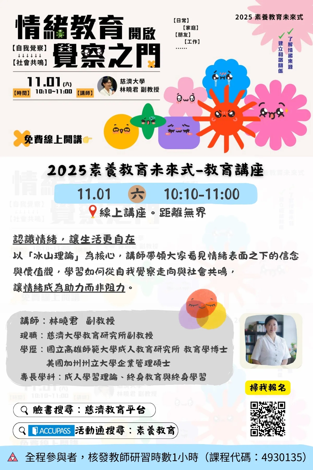 情緒,不只是感受,更是一面照見自己的鏡子,透過「冰山理論」,我們學會看見情緒之下的信念與需求,了解情緒背後的「冰山理論」,學習自我覺察,改善人際互動,將情緒教育延伸到家庭與社會,提升自我理解與共感力,無論你是教育工作者、家長或單純想更了解自己的朋友,這場講座都將給你全新的啟發!