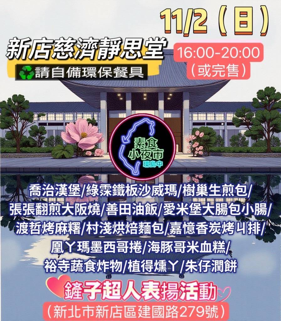 【新店】《靜靜走市集》PART 2 分享好友 2025/11/02 15:00 ( 11/02 15:00更新) 慈濟新店靜思堂《靜靜走市集》PART2致敬超人·用愛光復 靜靜的走,慢慢的逛,輕輕的,美好世界。2025是「超人年」。我們致敬每一位在樺加沙風災後,走進光復鄉、鏟泥巴、重建家園的超人,謝謝那些揮汗的手、堅強的心、與溫柔的鄉親。這個夏末初秋,讓我們乘著風,在愛裡前行,成為別人生命中的超人。 11月2日(星期日)下午2:00-8:00 新店靜思堂(建國路279號) 主辦:文山家協 協辦:慈濟北二環保團隊、素食小夜市 攤商:蔬食友善品牌 表演:歌舞×超人分享×光復致敬×音樂蔬食饗宴 登入後可以閱讀全文 關鍵字: 新店靜思堂 市集 分享好友 喜歡我們的文章嗎?歡迎加入慈善新聞網