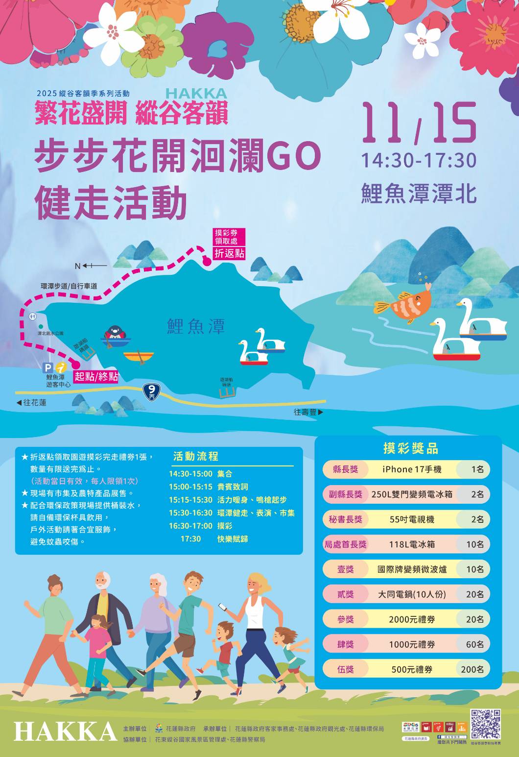 步步花開,洄瀾go!邀你一起來鯉魚潭潭北健走,走出健康、走向幸福~當日現場活動還有:精采表演、在地特色市集攤位、超值摸彩抽獎(含 iPhone 17 等大獎!)