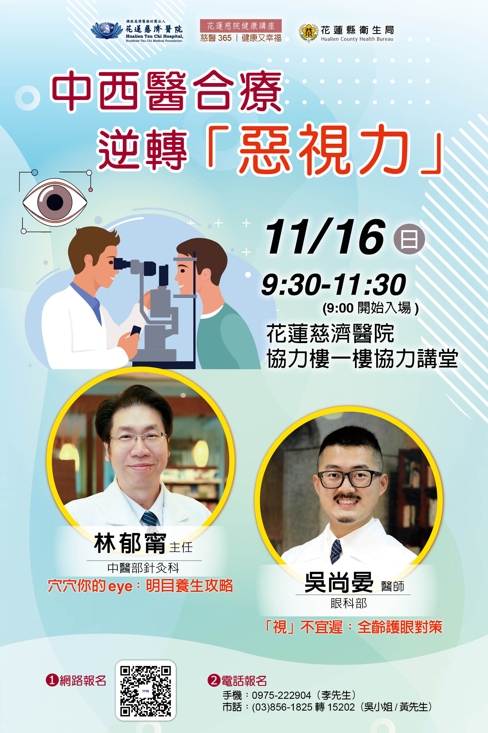 花蓮慈濟醫院誠摯邀請您參加【慈醫365 健康又幸福】系列講座,從中醫的經絡智慧到西醫的臨床觀點,一次掌握「護眼、養眼、明眼」的關鍵心法。