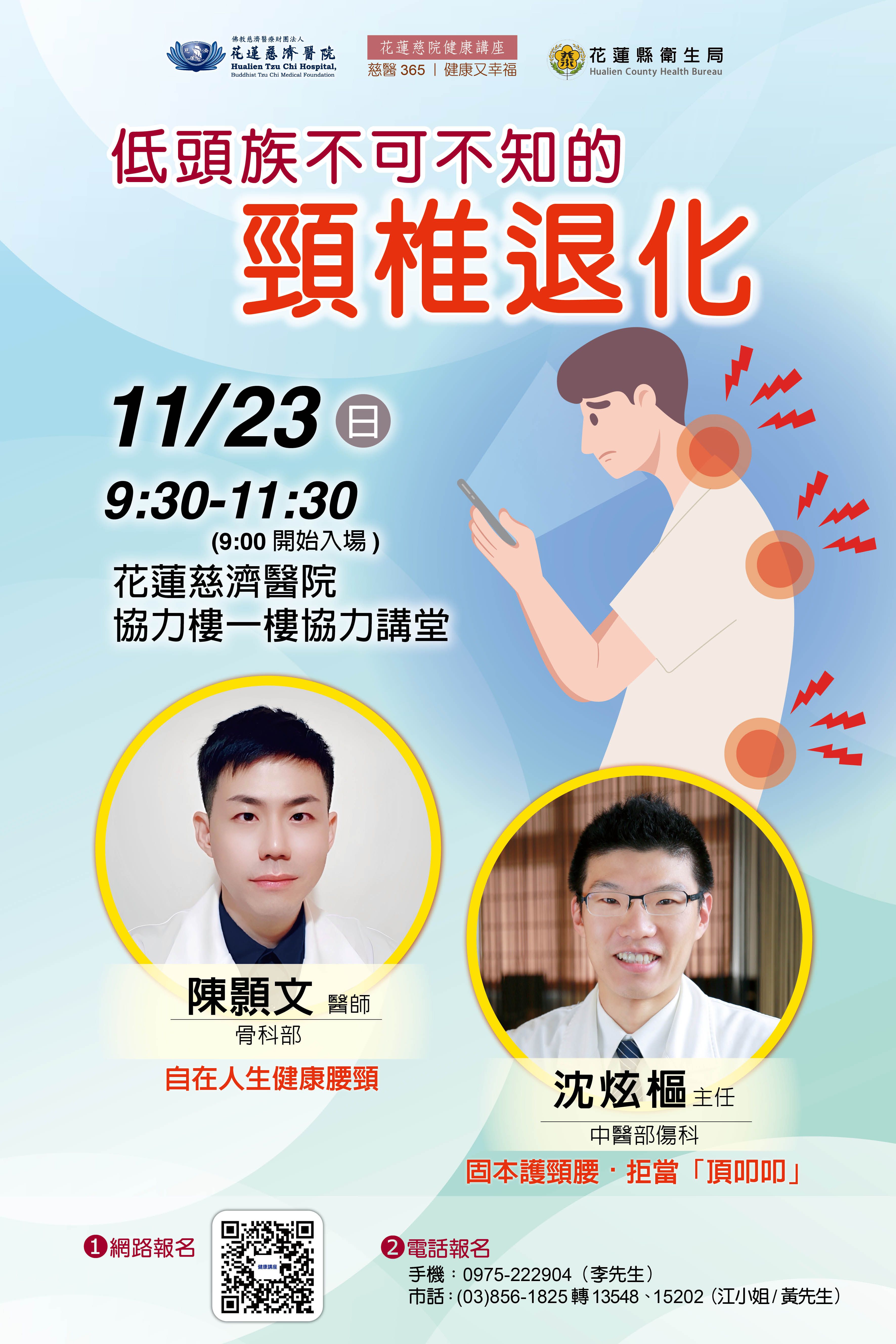 花蓮慈濟醫院誠摯邀請您參加【慈醫365 健康又幸福】系列講座,讓專業醫師帶您從不同角度認識頸椎,學會舒緩、保養與強健的方法,讓身體更靈活,生活更自在。