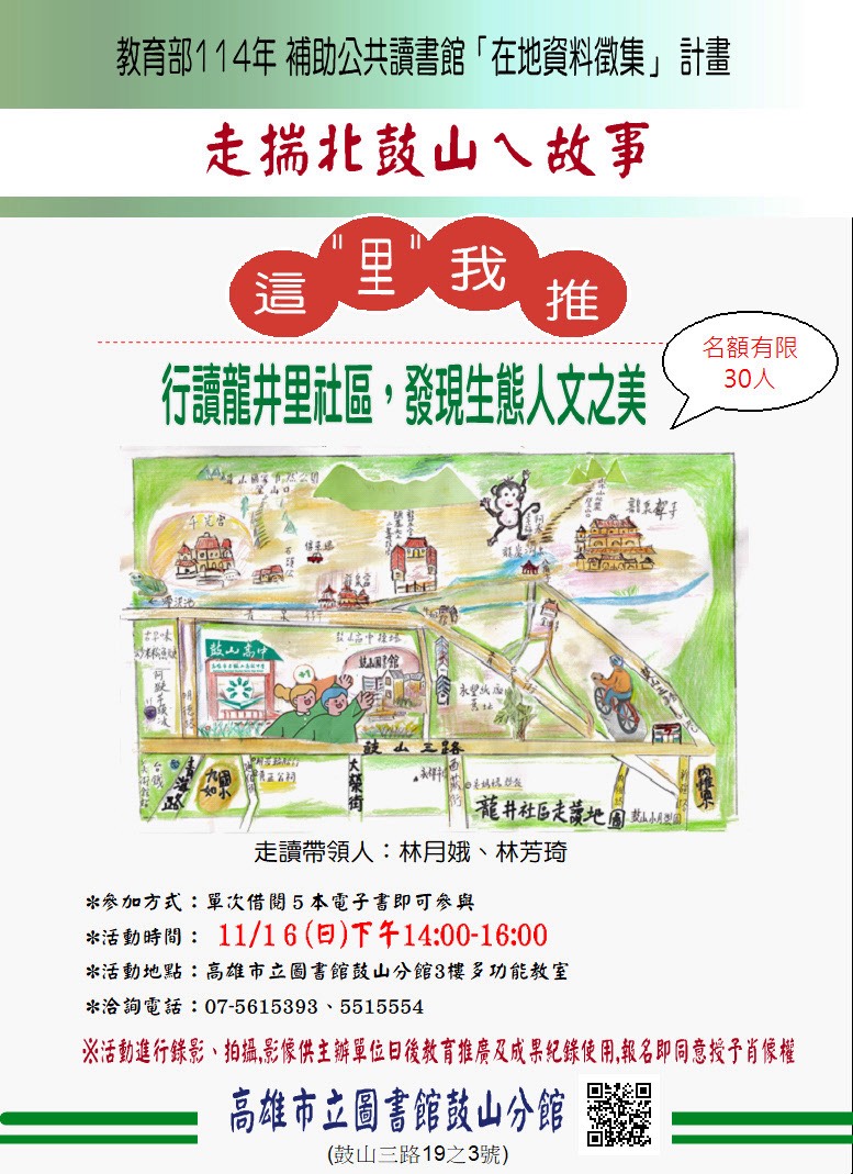 地點:高雄市立圖書館鼓山分館 3 樓多功能教室、龍井社區