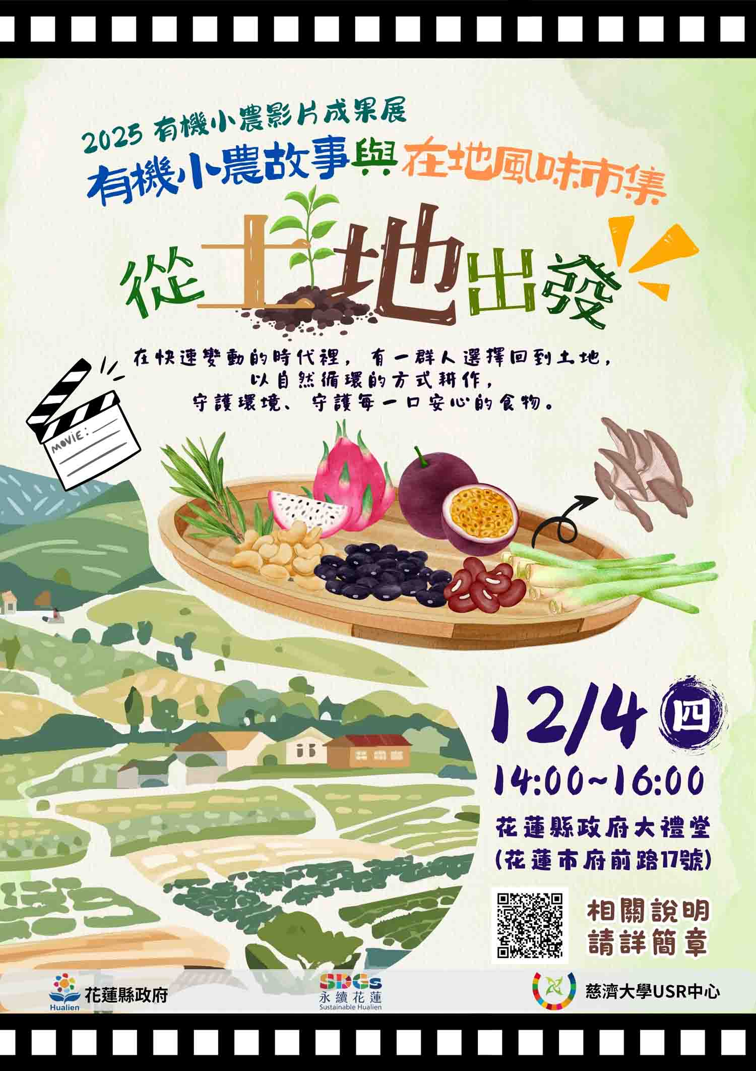 在快速變動、講求效率的時代裡,仍有一群人選擇以自然循環、友善環境的方式耕作,為社會提供安心健康的食物。花蓮縣政府將於 12月4日下午2點 在 花蓮縣政府大禮堂 舉辦《2025有機小農影片成果展》,以影像、風味市集與交流三種形式,帶領民眾走入有機農友的日常,感受土地的韌性與農民的真誠。