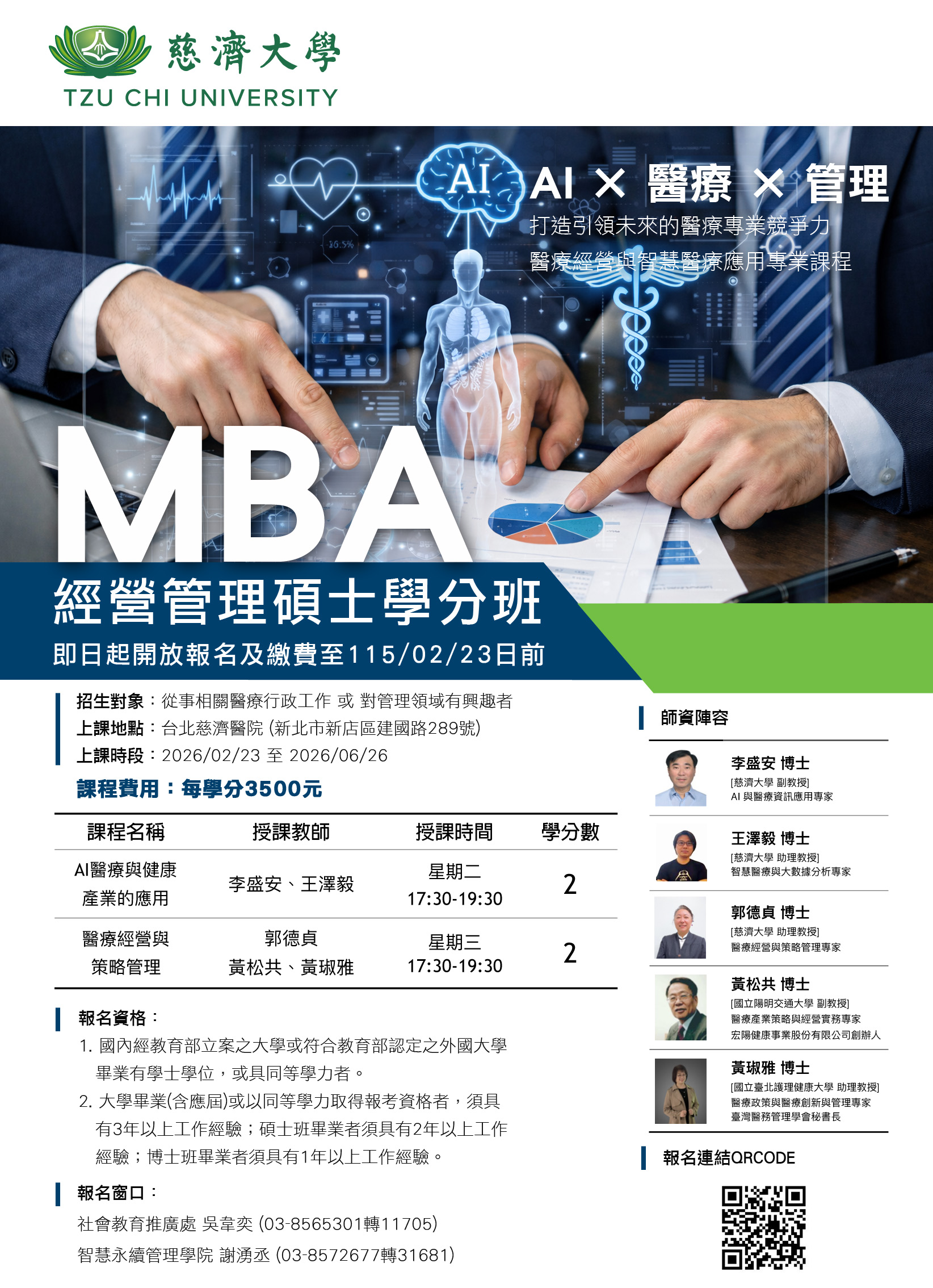 •課程諮詢: 慈濟大學智慧永續管理學院 謝湧丞 03-8572677 分機 31681