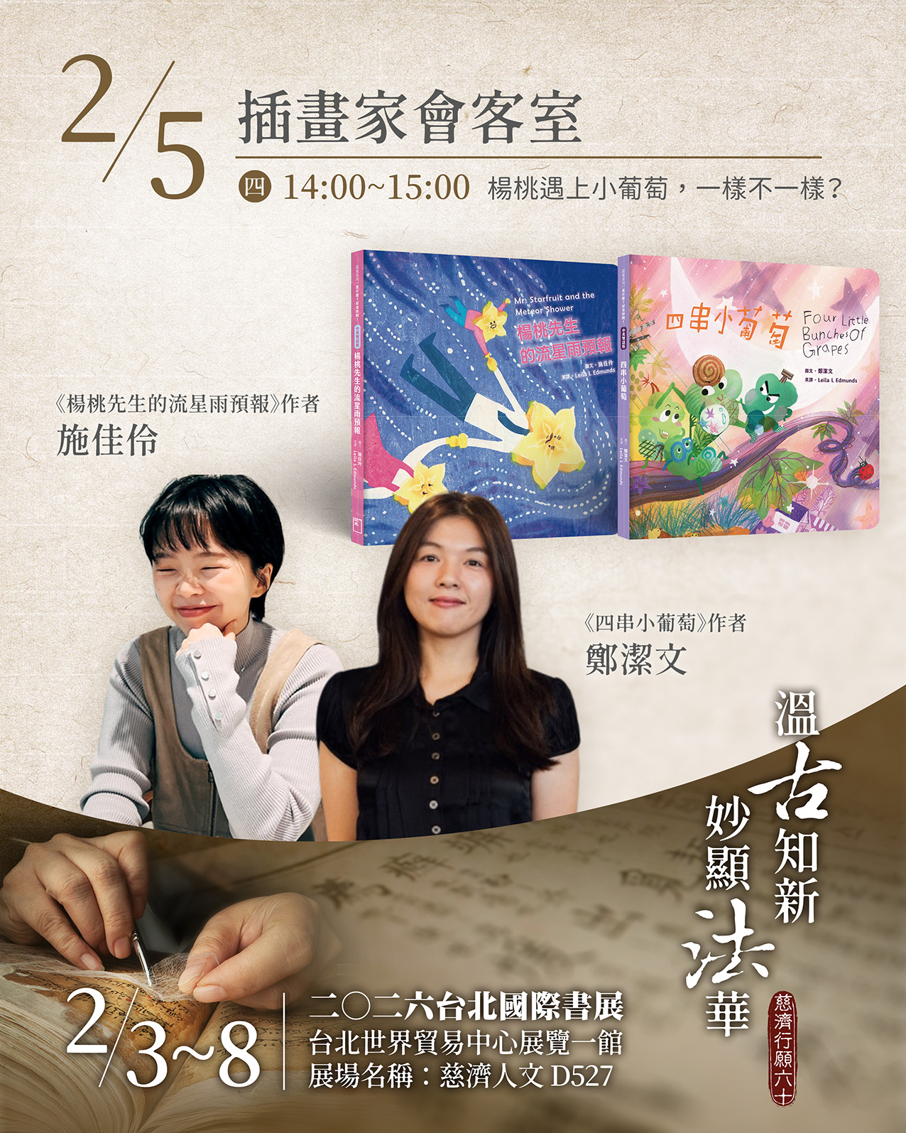 施佳伶老師以水印木刻呈現《楊桃先生的流星雨預報》,歷時兩年多、刻了近百塊木板,豐富畫面與趣味故事,就像流星雨般令人驚嘆。邀請你來聆聽,食育主題與不同媒材激盪出的火花。