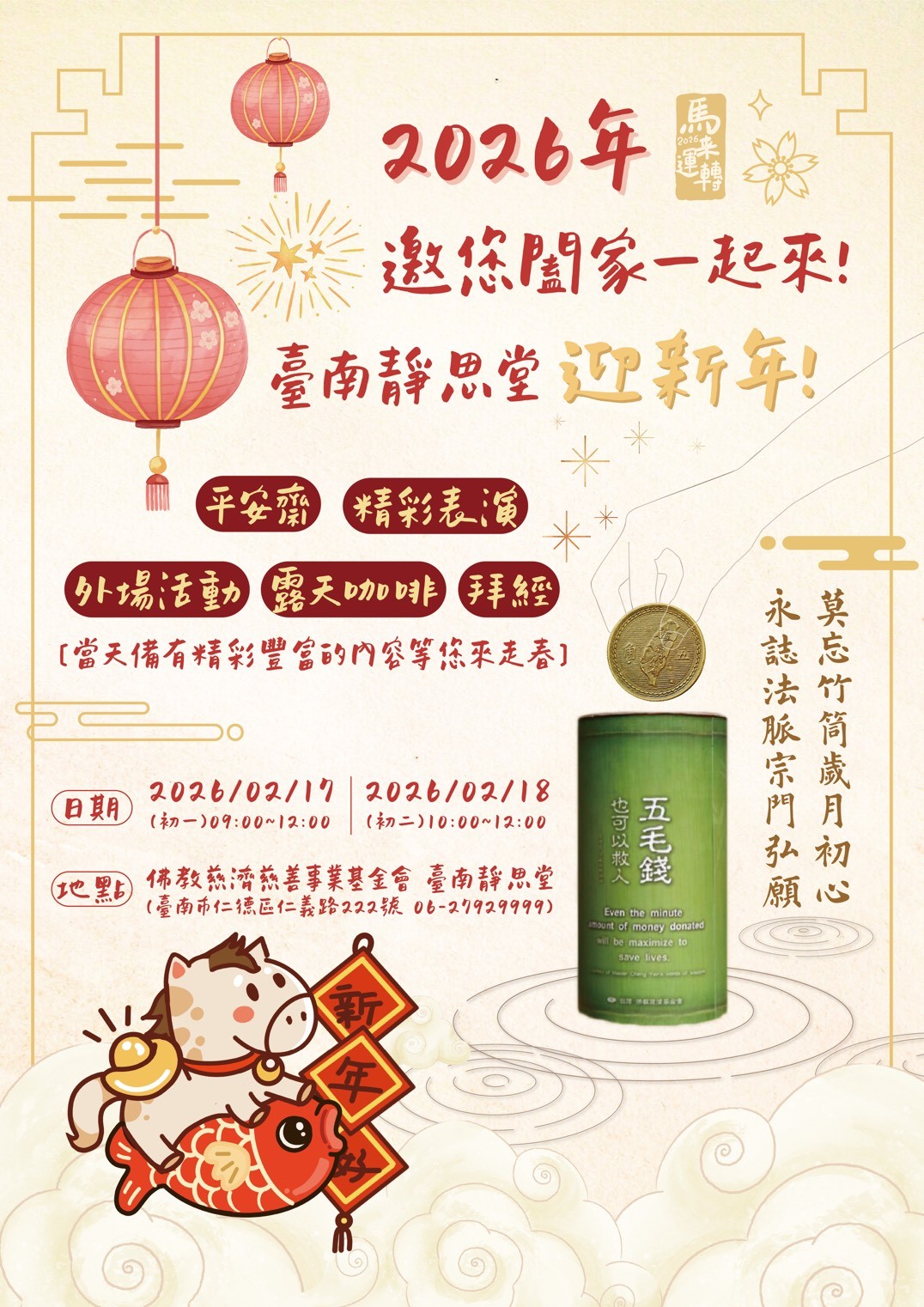 【臺南】臺南靜思堂 迎新年 分享好友 2026/02/18 18:00 ( 02/02 14:24更新) 2026年邀您闔家一起來~ 臺南靜思堂迎新年 活動內容: 平安齋 精彩表演 外場活動 露天咖啡 拜經 地址:臺南市仁德區仁義路222號(臺南靜思堂) 時間:02/17 初一 09:00~12:0002/18 初二 10:00~12:00當天更多精彩活動等你來走春! 登入後可以閱讀全文 分享好友 喜歡我們的文章嗎?歡迎加入慈善新聞網