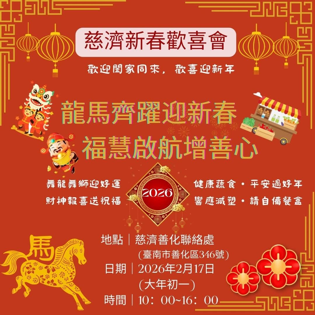 【臺南】慈濟善化聯絡處 新春歡喜會 分享好友 2026/02/17 16:00 ( 02/02 14:36更新) 慈濟善化聯絡處 大年初一(02/17)新春歡喜會 歡迎闔家蒞臨,一起喜迎新春! 大年初一當天,慈濟善化聯絡處將舉辦新春歡喜會,與您共享溫馨時光! 慈濟祝福大家:新的一年平安喜樂、福滿人間~~~ 地點: 臺南市善化區346號(慈濟善化聯絡處) 時間: 02/17(初一)10:00~16:00 善化聯絡處是社會的活動中心、諮詢中心、社教推廣中心、災難協調中心,更可以是您的好鄰居、好厝邊,社區民眾心靈成長的好所在 登入後可以閱讀全文 分享好友 喜歡我們的文章嗎?歡迎加入慈善新聞網