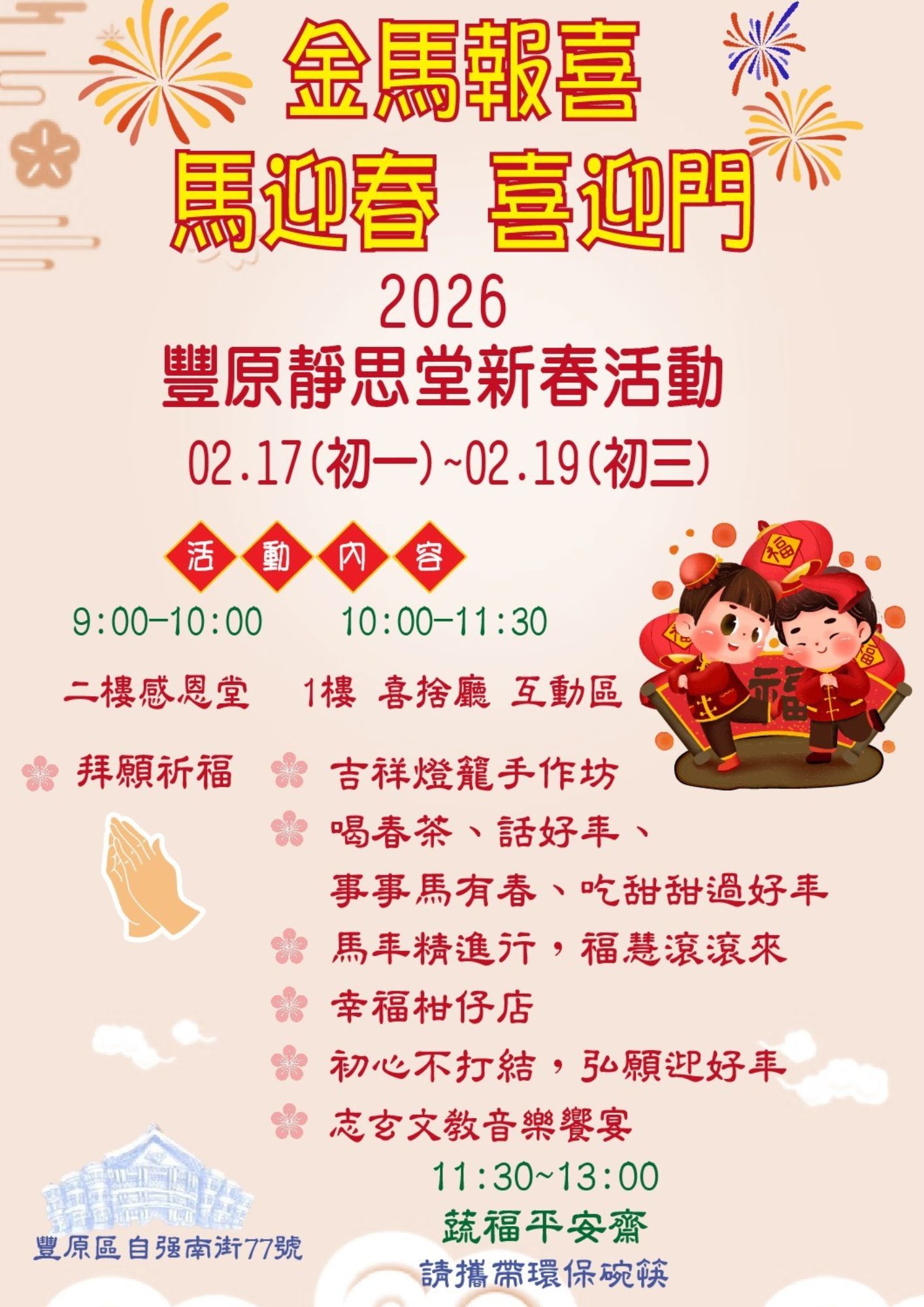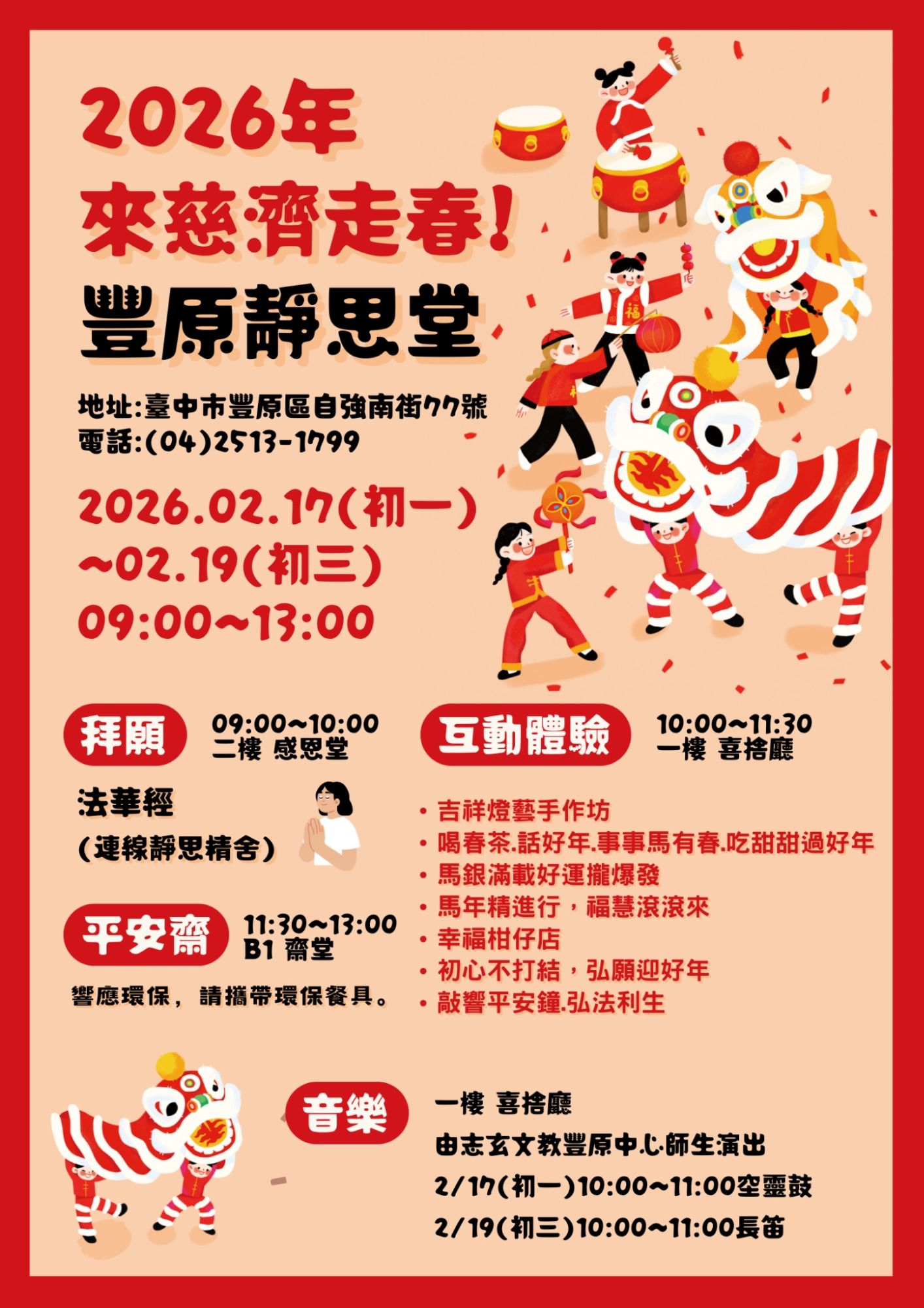 【臺中】豐原靜思堂 今年來慈濟走春! 分享好友 2026/02/19 15:00 ( 02/05 10:03更新) 2026年邀您闔家一起來~ 豐原靜思堂迎新年來慈濟走春! 活動內容: 拜願 平安齋 互動體驗 音樂饗宴 地址:豐原靜思堂 時間:02/17(初一)至 02/19(初三)09:00–13:00 新春好去處,邀您與家人一同走進豐原靜思堂~在誦經祈福與人文互動中,迎接嶄新的一年。年味不只在熱鬧裡,更在一份安心與祝福之中! 登入後可以閱讀全文 關鍵字: 走春 分享好友 喜歡我們的文章嗎?歡迎加入慈善新聞網
