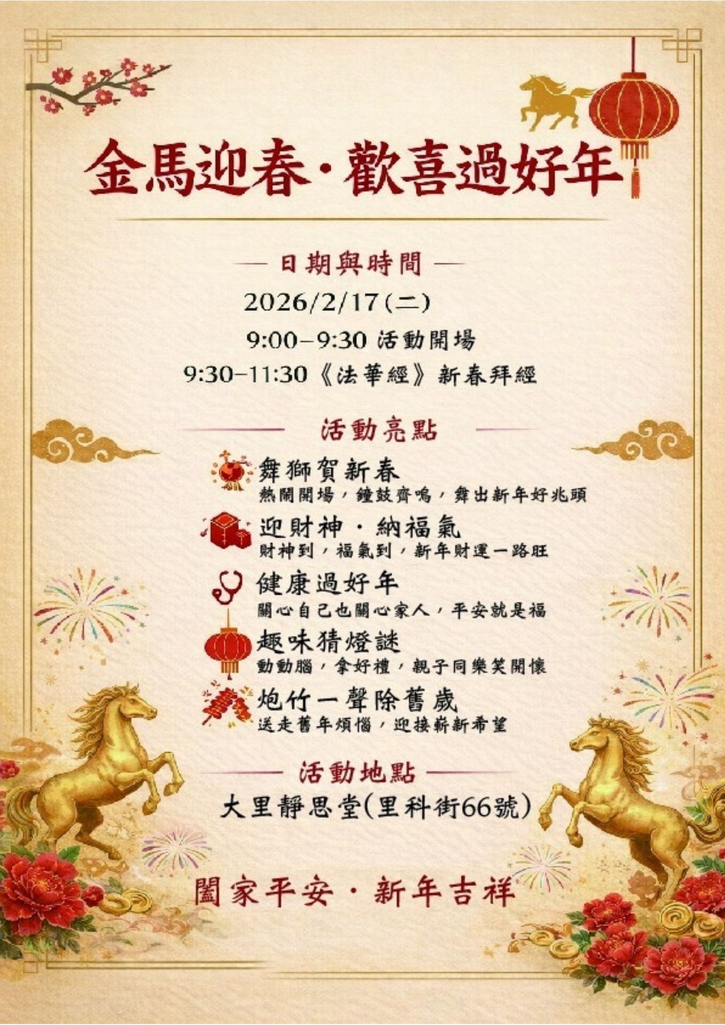 【臺中】大里靜思堂 金馬迎春 歡喜過好年 分享好友 2026/02/17 12:00 ( 02/05 11:01更新) 2026年邀您闔家一起來~ 大里靜思堂迎新年金馬迎春 歡喜過好年 活動內容: 舞獅賀新春 迎財神 納福氣 趣味猜燈謎 地址:大里靜思堂 時間:02/17(二)大年初一09:00–09:30 活動開場09:30–11:30 新春拜經 當天還有多項新春活動~邀您與家人一同走春迎福。在鑼鼓聲與祝福聲中...迎接新的一年,平安吉祥、福氣滿滿! 登入後可以閱讀全文 關鍵字: 走春 分享好友 喜歡我們的文章嗎?歡迎加入慈善新聞網